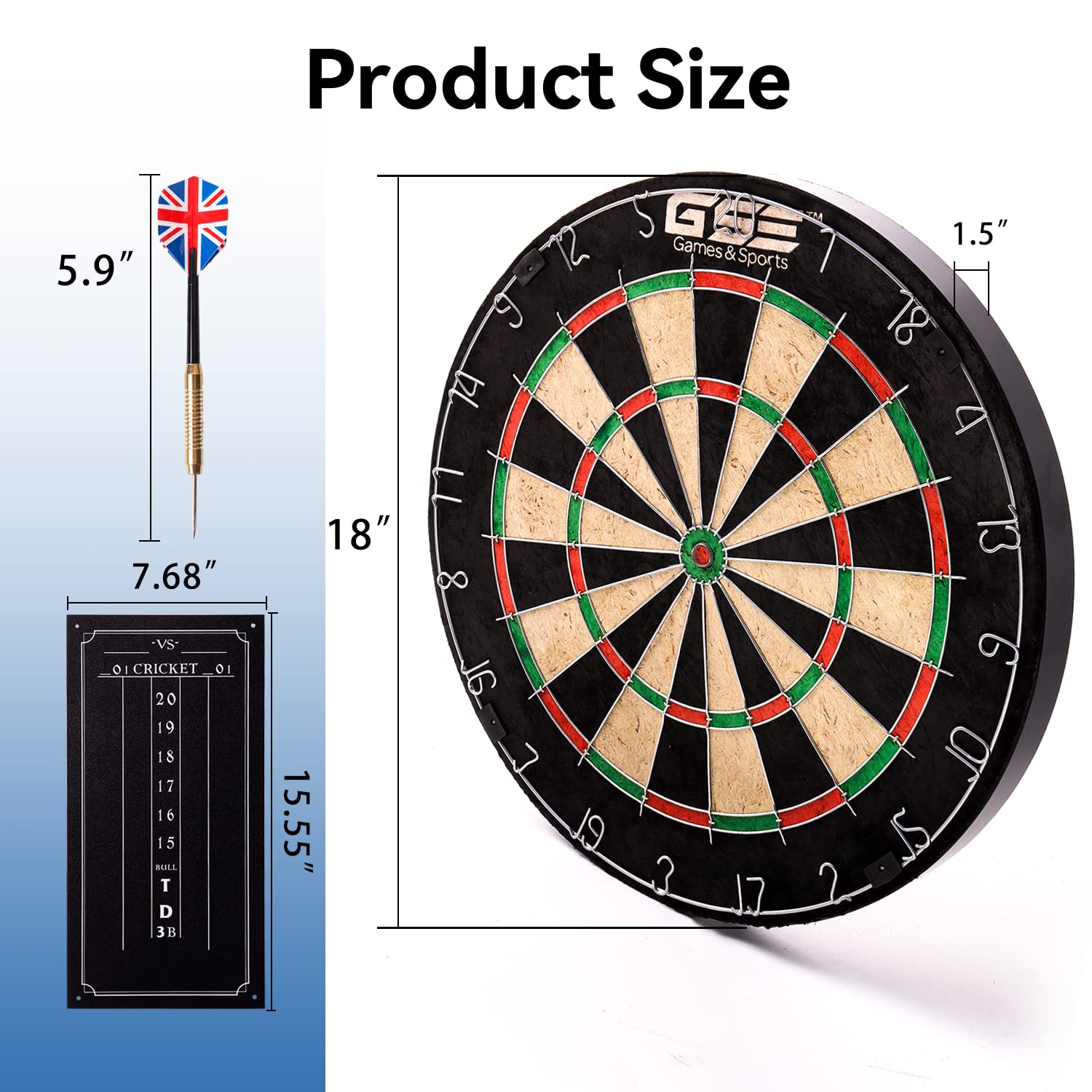 Details: QUALITY - The professional dartboard is made from enhanced self-healing sisal bristle fibers compressed together, more durable than cork or wound paper boards when used with steel tip darts. OFFICIAL SIZE- Official tournament size, measuring 18" diameter and 1.5" D. Staple-free bullseye helps prevent bounce-outs. A removable number ring allows you to rotate the dartboard easily. HIGH SCORING - The thin and rounded steel wires allow darts to slide off the spider and into the board's target area for a good shot and excellent scoring potential. ACCESSORIES - Includes six 17g steel tip darts and dartboard wall mounting hardware. A black chalk scoreboard with two chalks and an eraser. MULTIPURPOSE - Great for a sports match, clubs, game rooms, man caves, bars, and more... Perfect for family dart night or friendly competitions with your fellows and players at all skill levels. ***The darts are prepackaged inside of the cardboard triangle white pocket, inside of the box.***