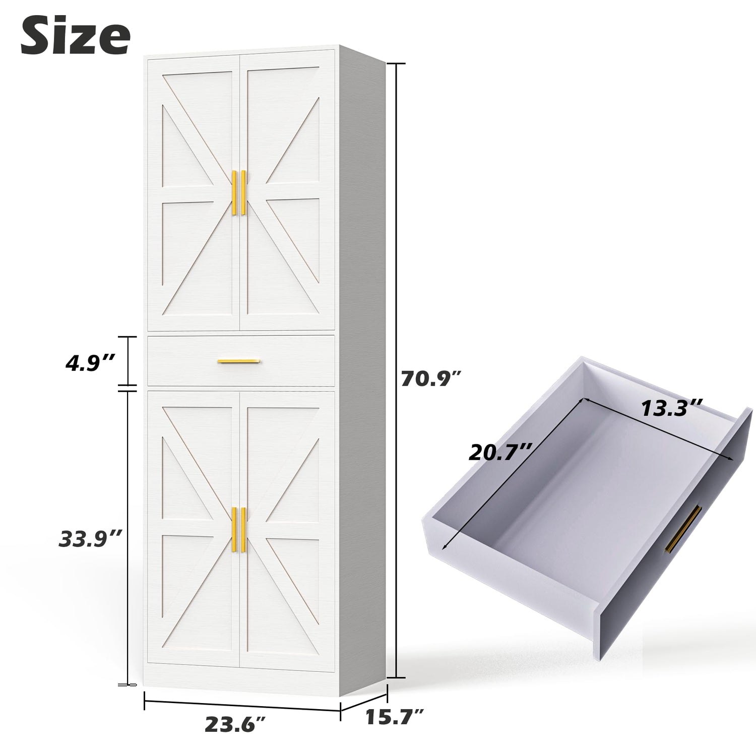 GTFURNI 71" Farmhouse Storage Cabinet with 4 Doors & Drawer, Adjustable Shelves Kitchen Pantry Cupboard, Freestanding Cabinet for Dining Room/Living Space, White