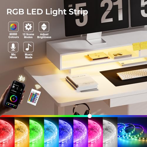 GTPLAYER Electric Standing Desk with Drawers, 48 x 24 Inch Height Adjustable Gaming Desk with Monitor Stand, Power Outlets & LED Lights, Home Office Sit Stand Up Desk with Memory Preset (White)