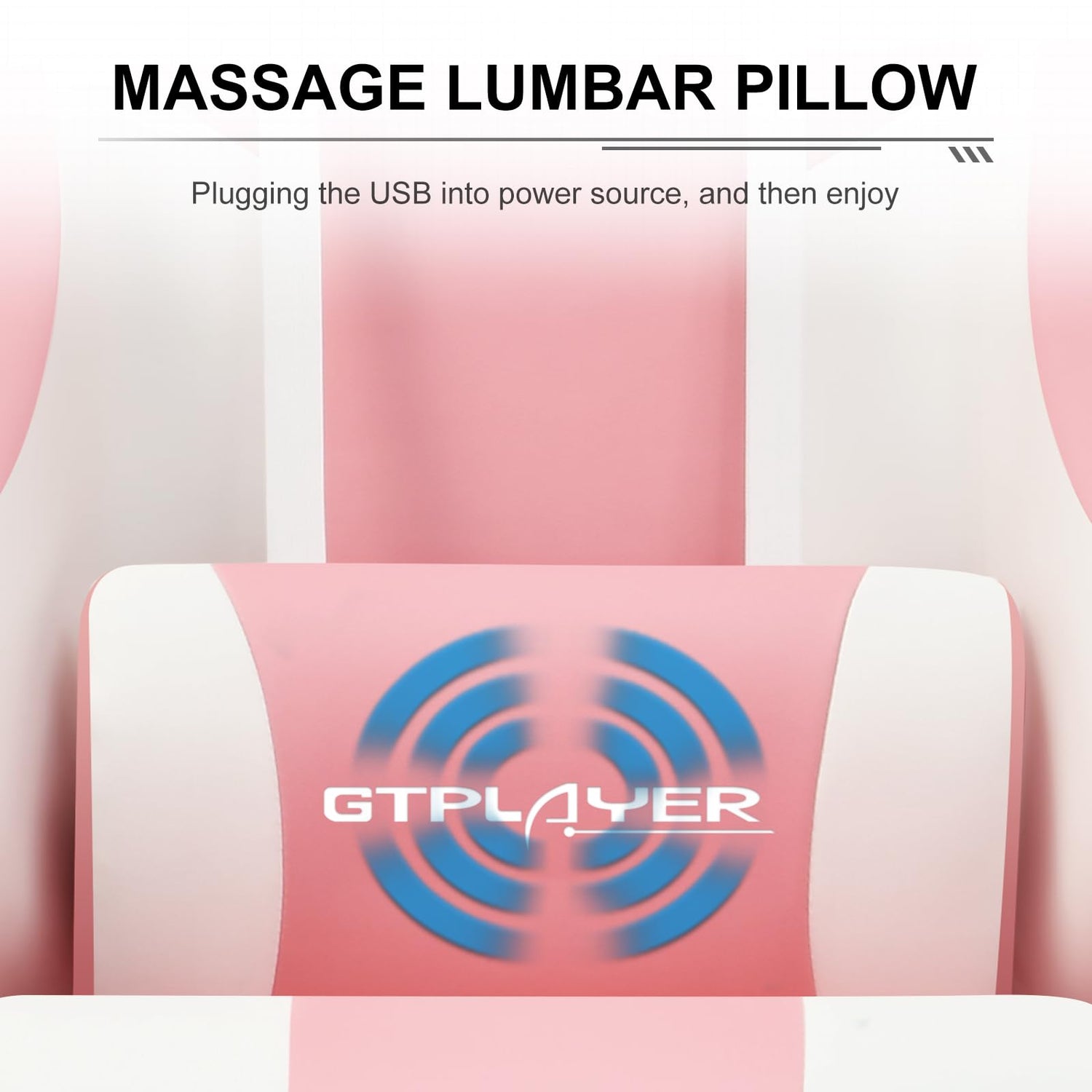 - 【Massager Lumbar Support】GTPLAYER gaming chair with headrest and massaging lumbar support; If you feel pain in your neck when working or gaming with your head down for a long time, recline your body backwards, Place the lumbar support in the right position and enjoy a moment of massage to relax your tired life; The lumbar pillow comes with a USB cable to connect to a power outlet, ensuring that the lumbar pillow effectively relieves lumbar fatigue