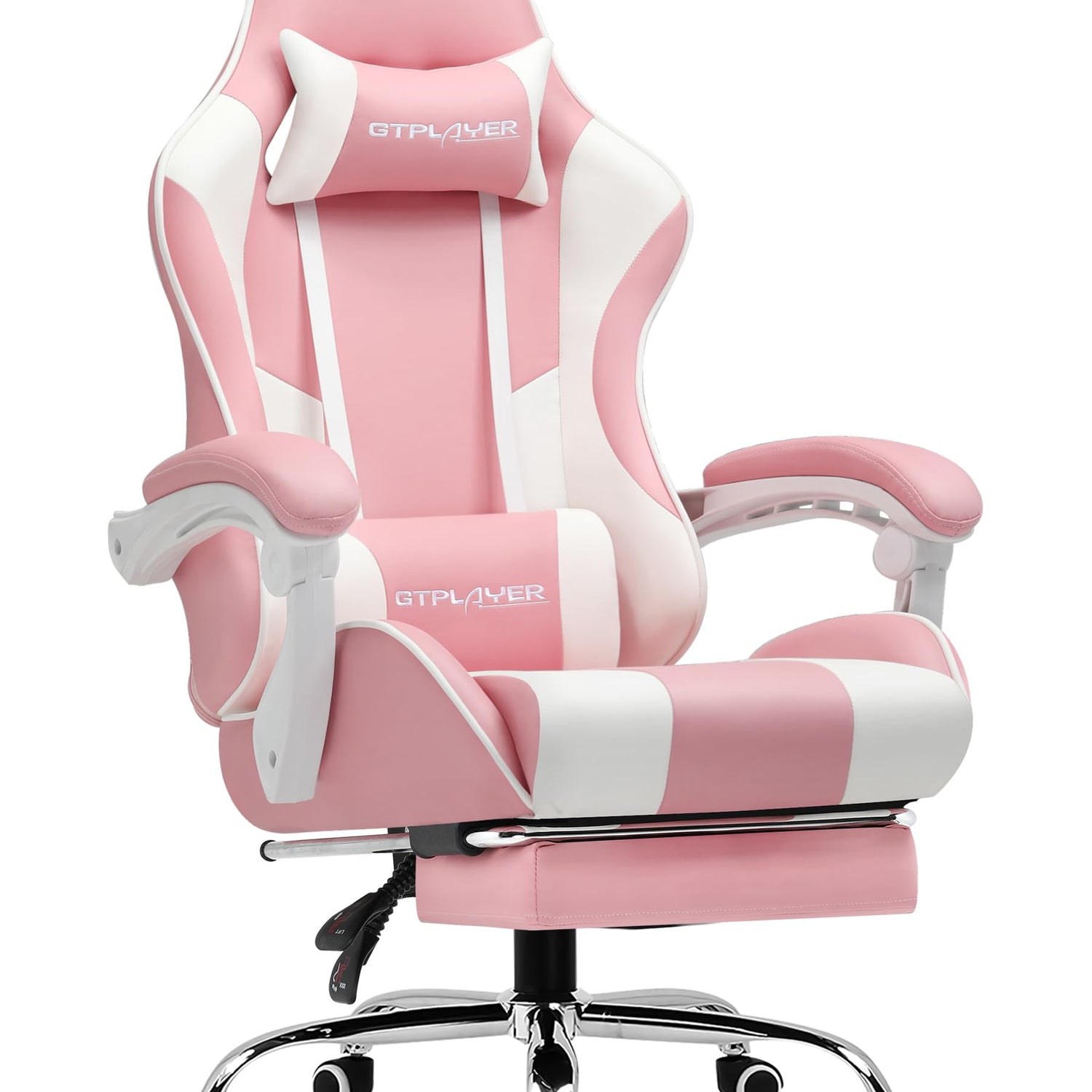 GTPLAYER Gaming Chair, Computer Chair with Footrest and Lumbar Support, Height Adjustable Game Chair with 360°-Swivel Seat and Headrest and for Office or Gaming (Faux Leather, Pink)
