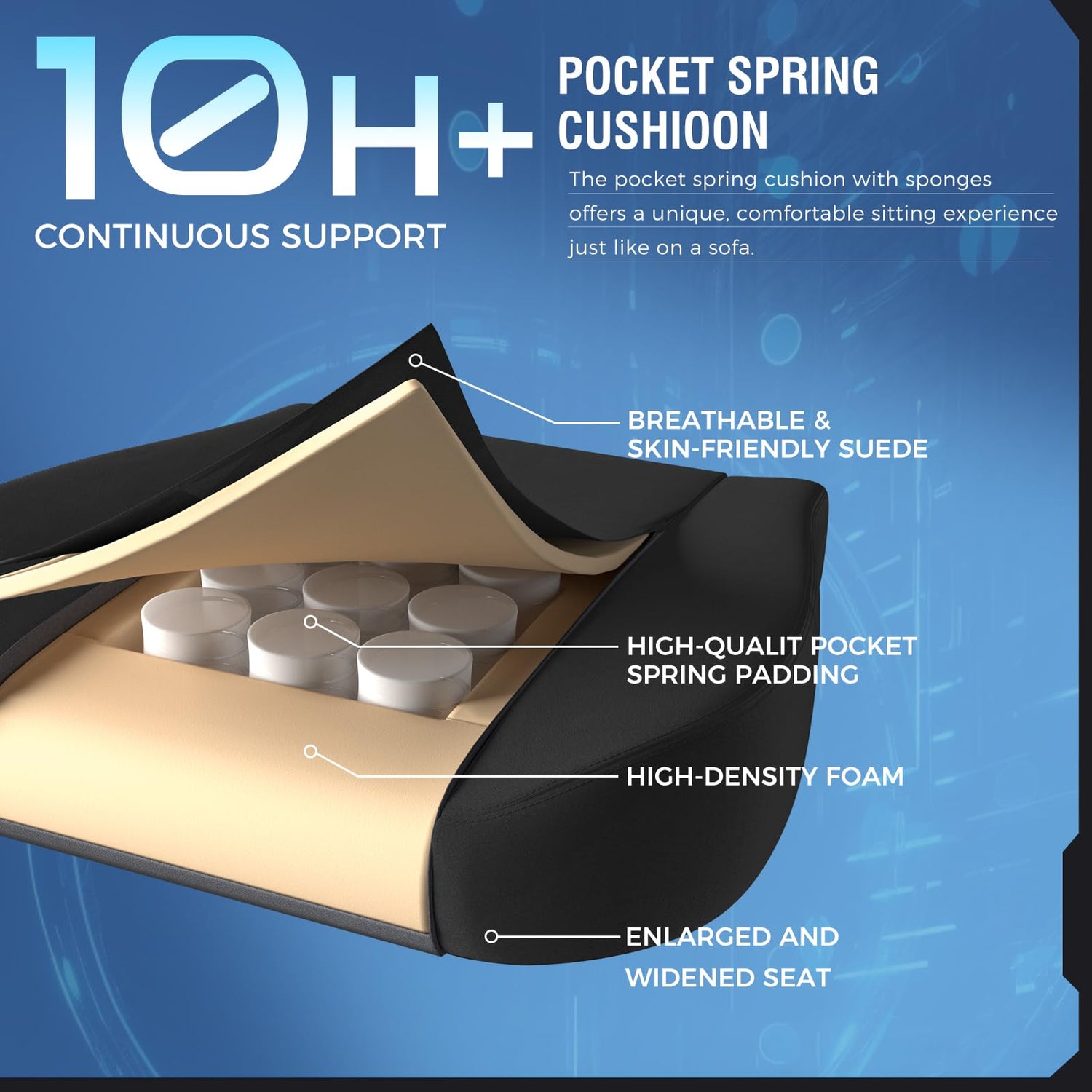 - Independent Integrated Spring Padding: GTPLAYER gaming chair is equipped with high-quality integrated spring padding that provides optimal comfort and support while gaming and working. This advanced seating technology provides dynamic support and adjusts to your position to ensure long-lasting comfort and reduce fatigue during long gaming sessions.