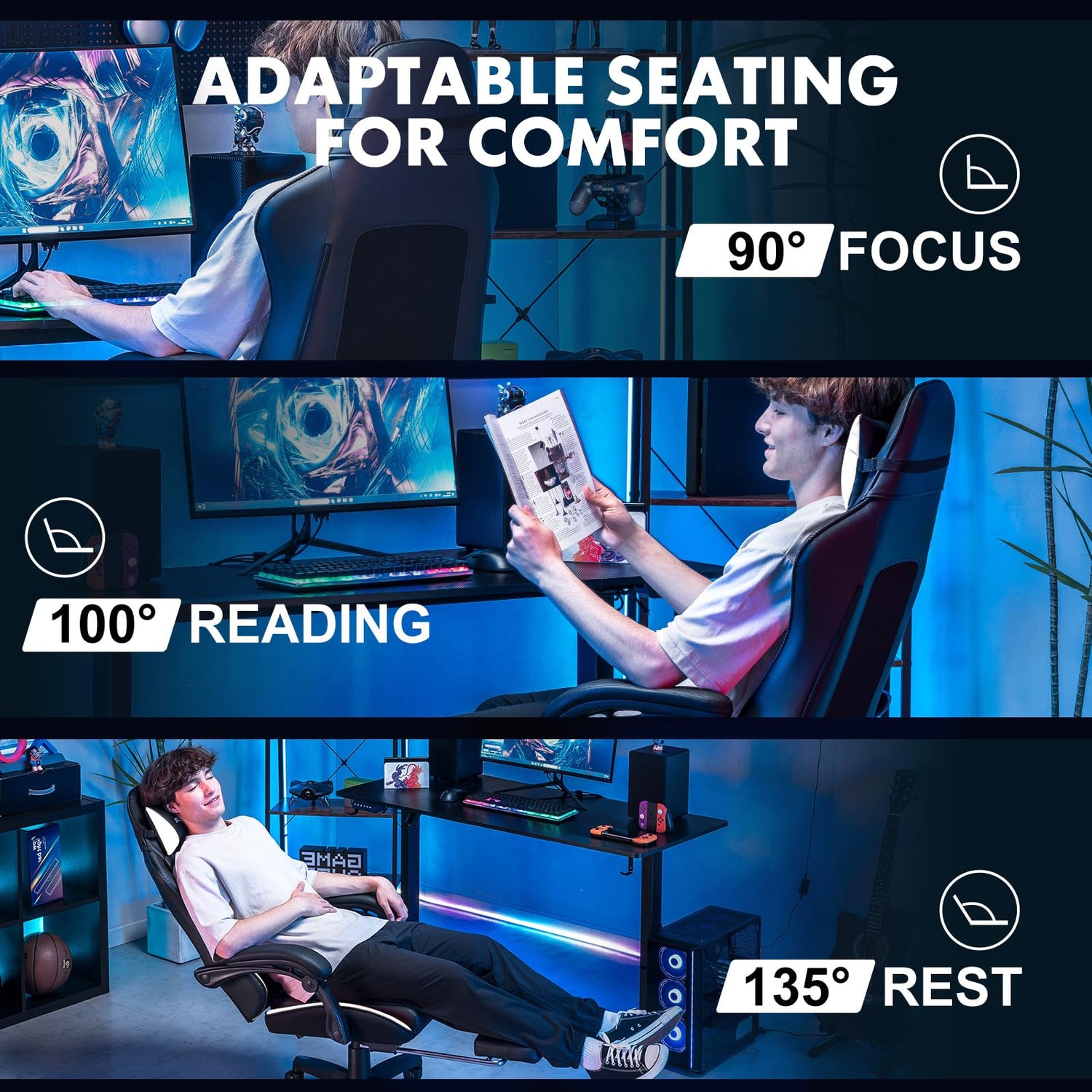 - 【Ergonomic Chair】: The cushion of this computer chair is soft and supportive, using the most advanced shaping cotton and native cotton, which is safe and environmentally friendly while reducing most of the fatigue. Secondly, the specially enlarged neck pillow and lumbar pillow of this gaming chair conform to ergonomic design, supporting your spine and providing a safe haven for your muscle fatigue, providing you with effective relief and a comfortable gaming experience.