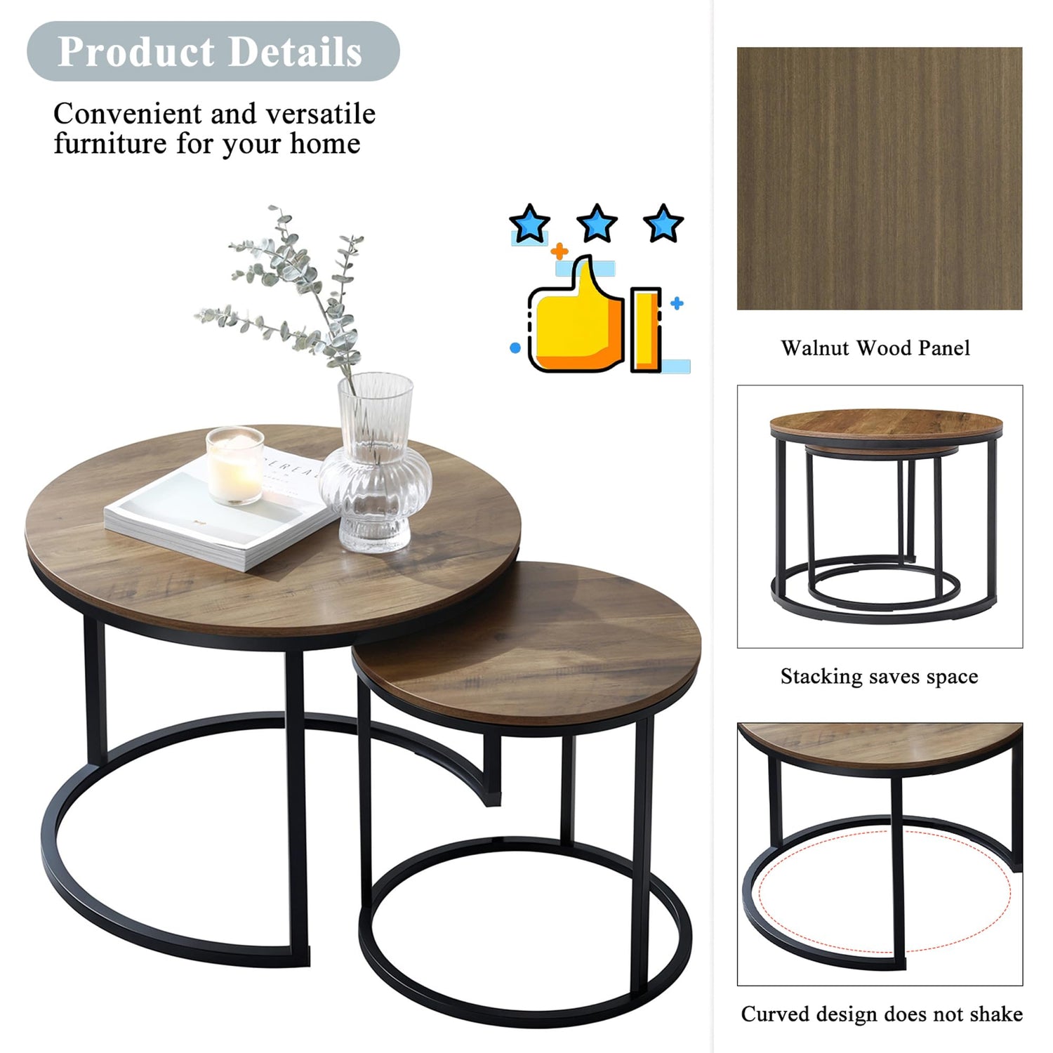 GUANGHONG Nesting Coffee Table Set of 2, Round Coffee Table w/Wood Grain Top, Modern Living Room Table with Sturdy Metal Frame, Industrial End Table Side Tables for Small Space Apartment (Black)