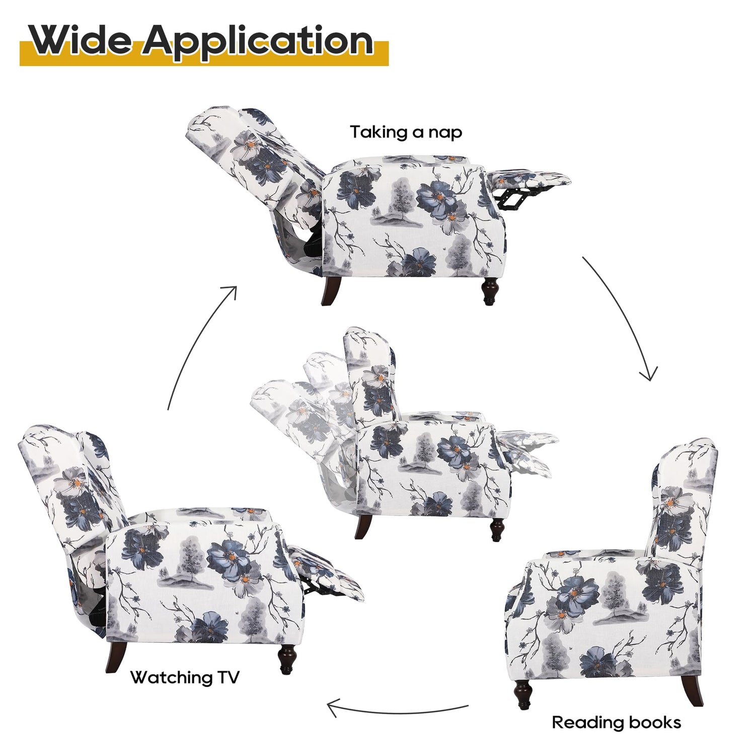 GUEAPY Mid-Century Modern Wingback Recliner Chair, Upholstered Push-Back Manual Recliner for Adults, Floral Accent Chair with Solid Wood Legs for Living Room & Bedroom, Blue