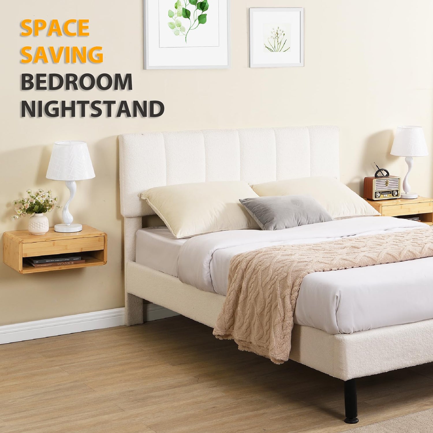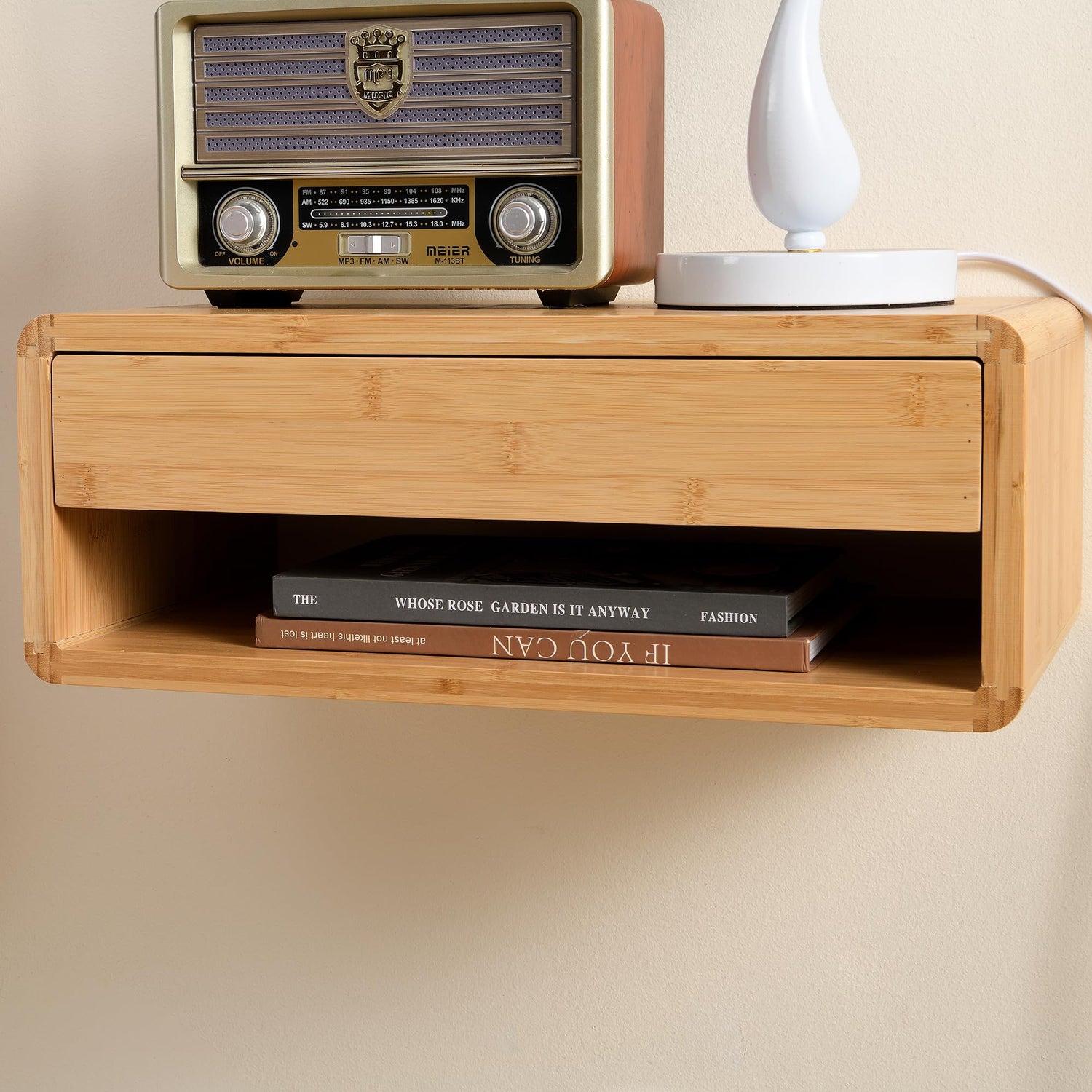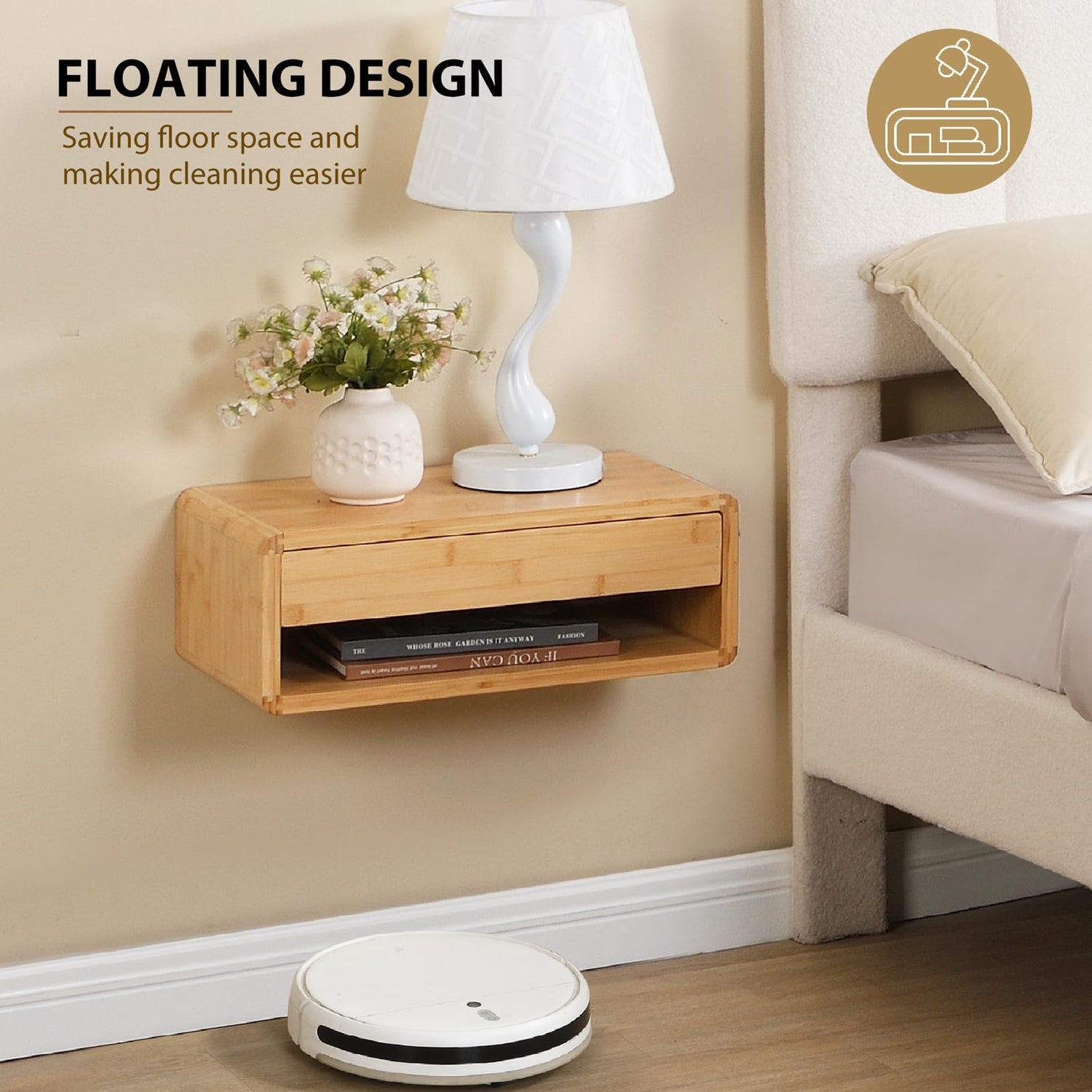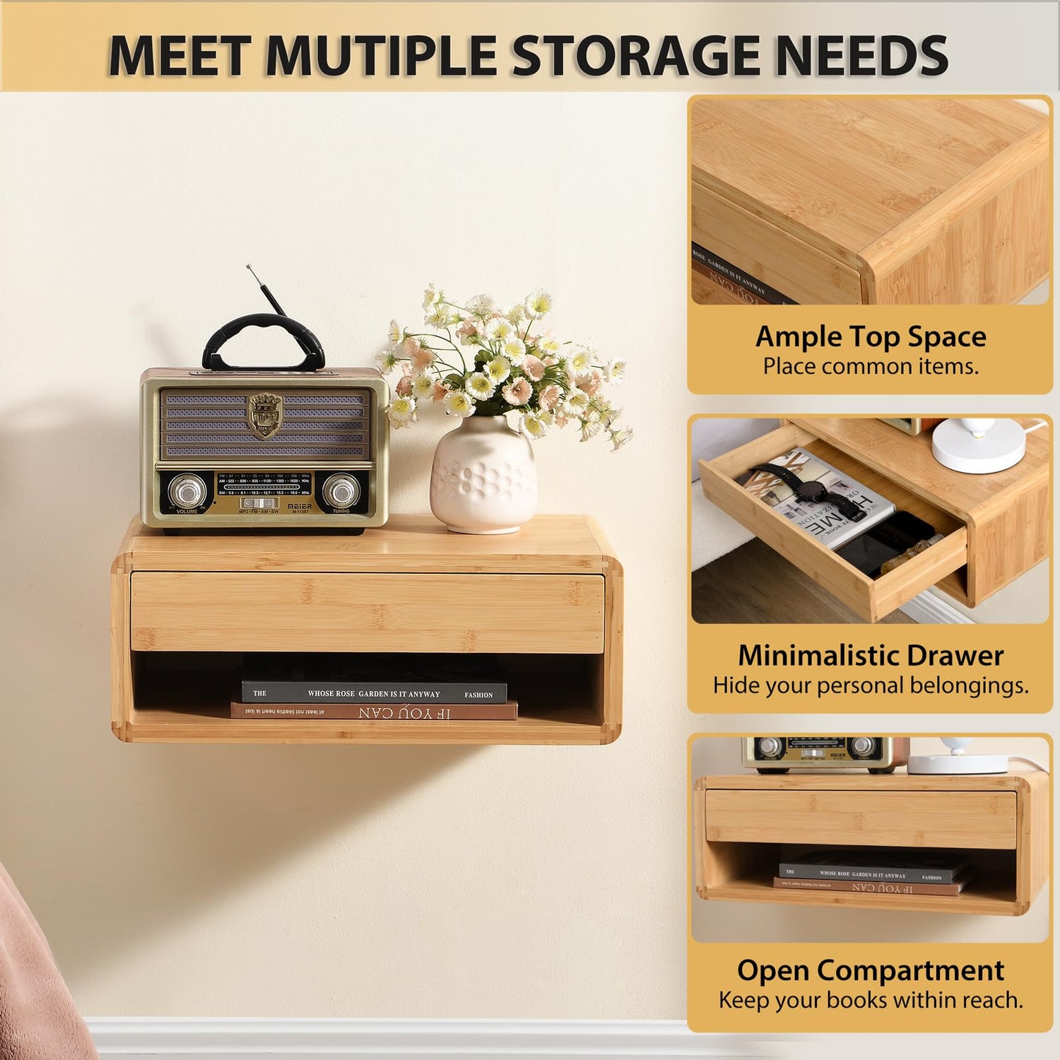 - Ample Storage Space: Our bamboo floating nightstand features open tabletop, enclosed drawer and semi-closed shelf, which can meet your different storage needs. The wide top and open compartment can hold your bedside essentials, like lamp, clock, glasses, and books