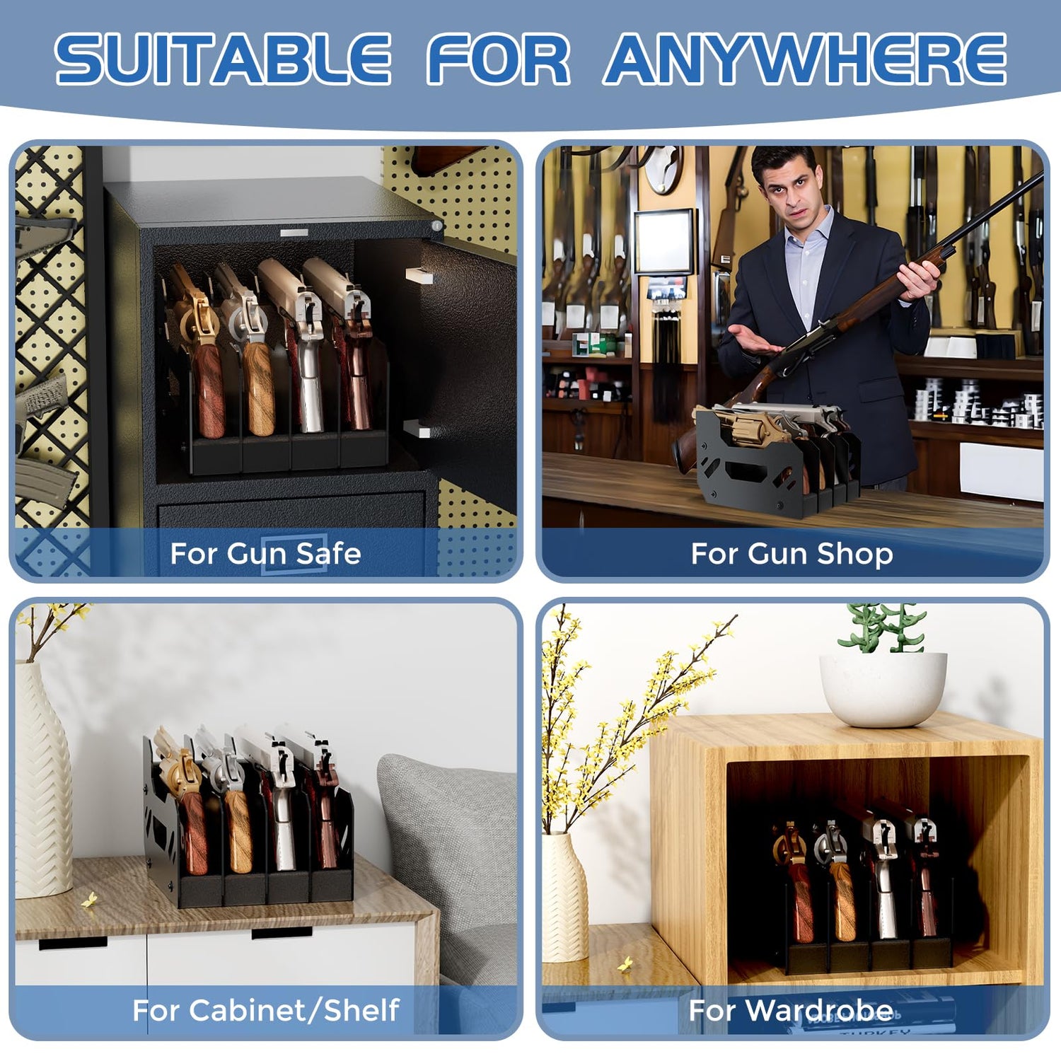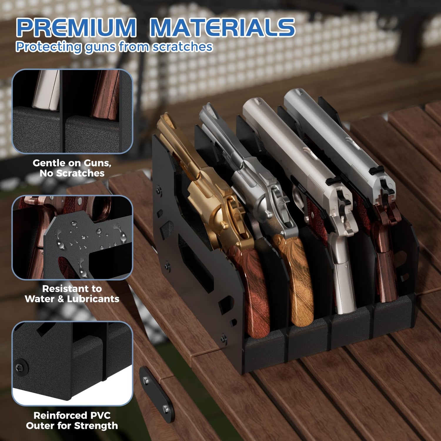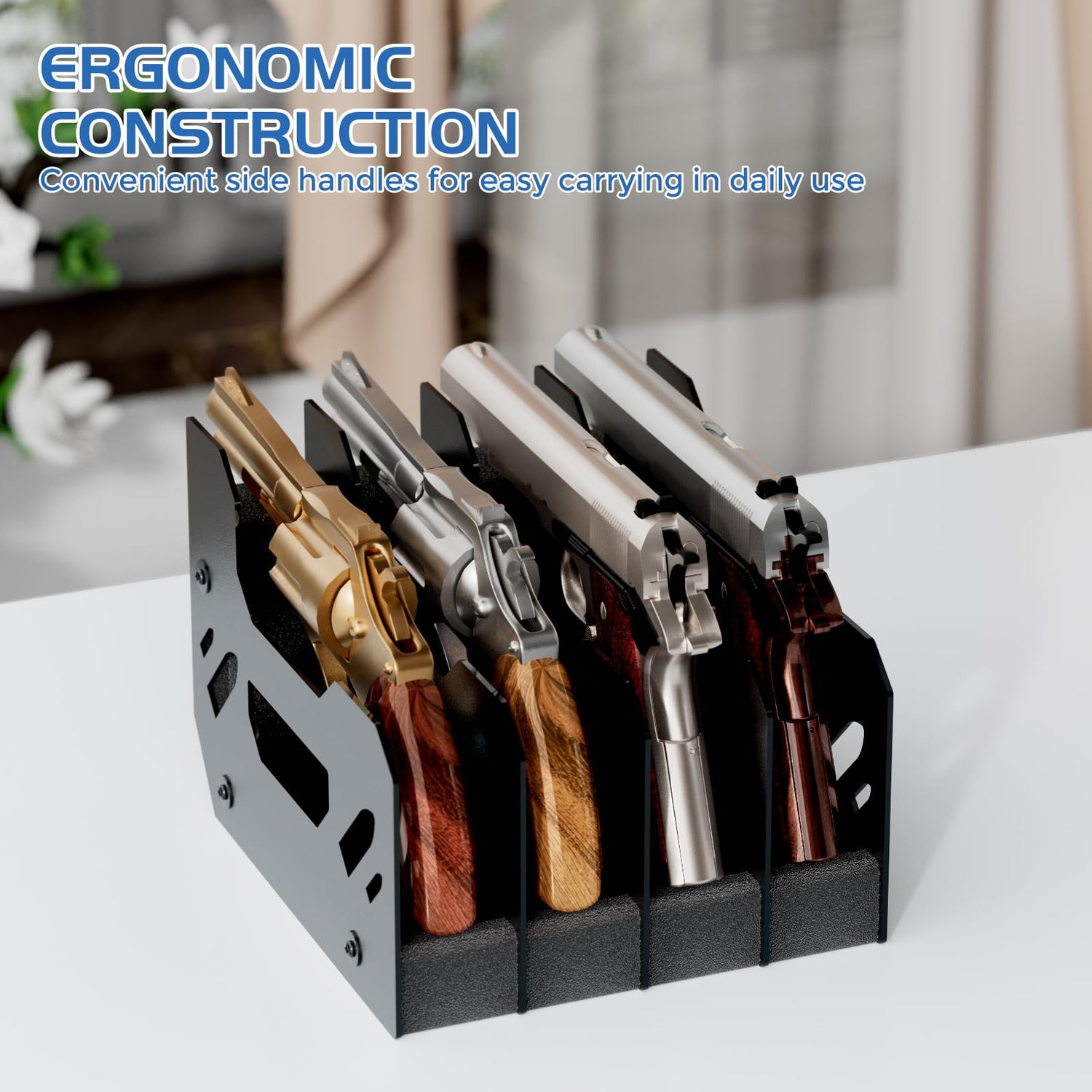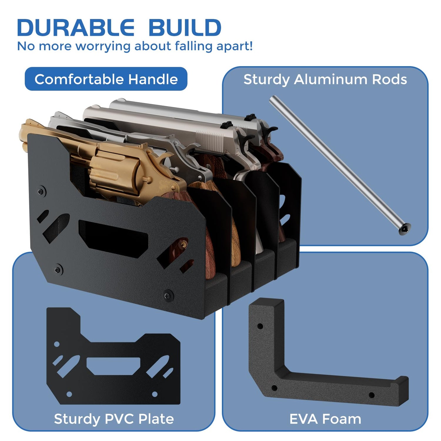 - PORTABLE & ANTI-SCRATCH PROTECTION: Designed to safeguard your handguns, this pistol stand is constructed with high-quality foam and durable PVC plates to prevent pistols from bumping into each other. The cushioned foam ensures your firearms stay securely in place, offering quick and convenient access for storage. The built-in handles on both sides make it easy to carry the entire rack, and placing it in the corner of your safe helps keep your space organized and tidy.