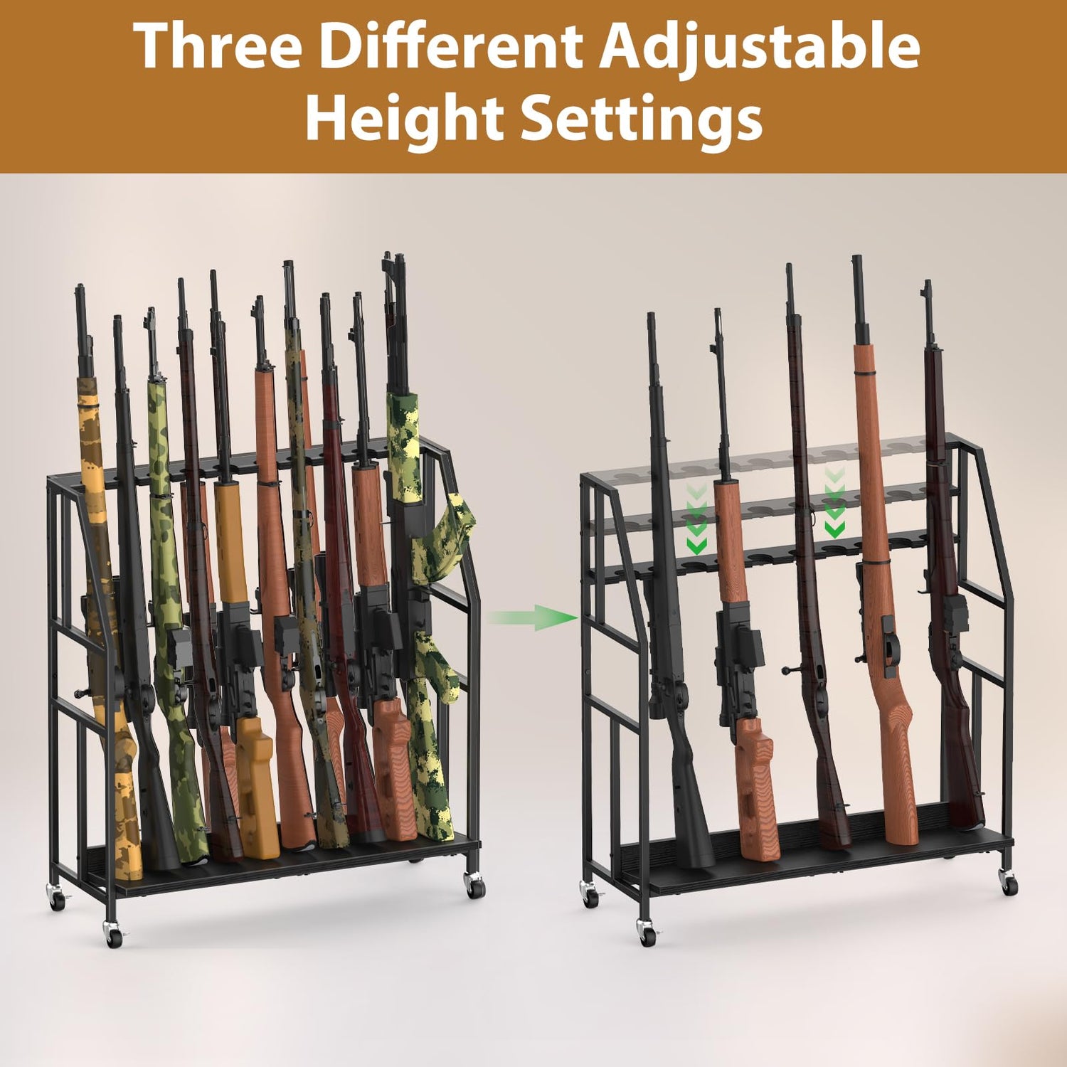 - Adjustable Height: This rifle stand offers 3 adjustable height settings (26.4", 31.1", and 33.8"), making it ideal for storing a wide range of firearms. It can hold up to 10 long guns, perfect for storing and organizing rifles, shotguns, and more