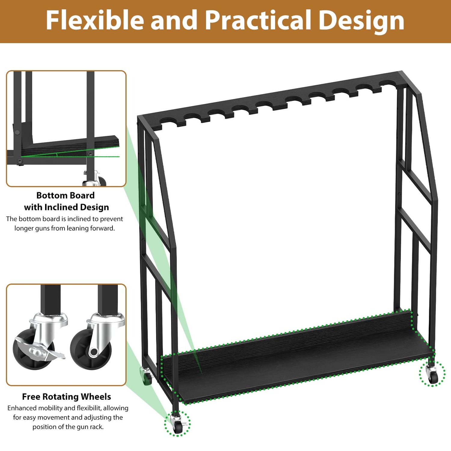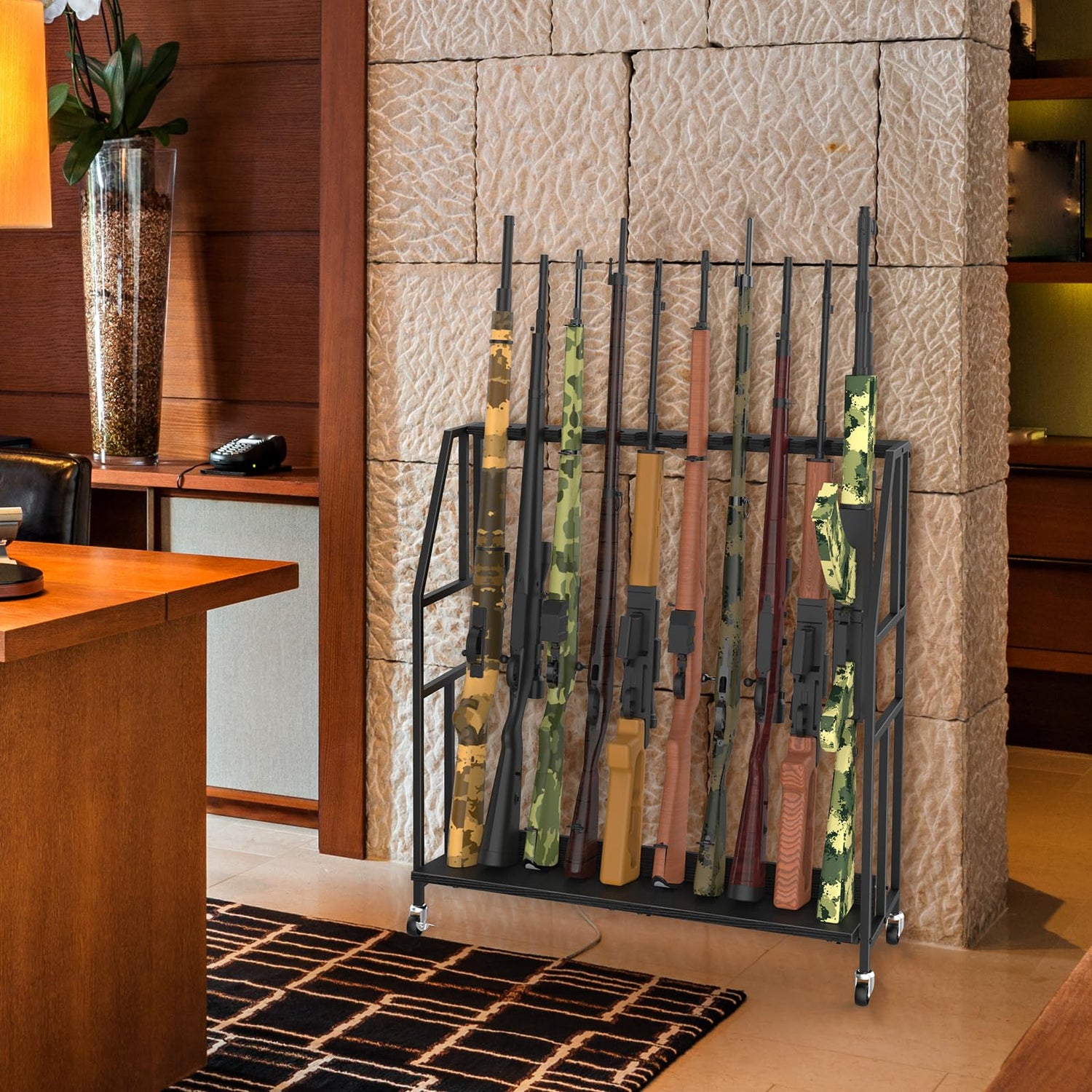 - Versatile Applications: This gun stand neatly stores and displays firearms, making it ideal for use in gun stores, shooting clubs, hunting cabins, or personal collections at home. With 4 swivel wheels (2 with brakes), it’s easy to move and securely position anywhere