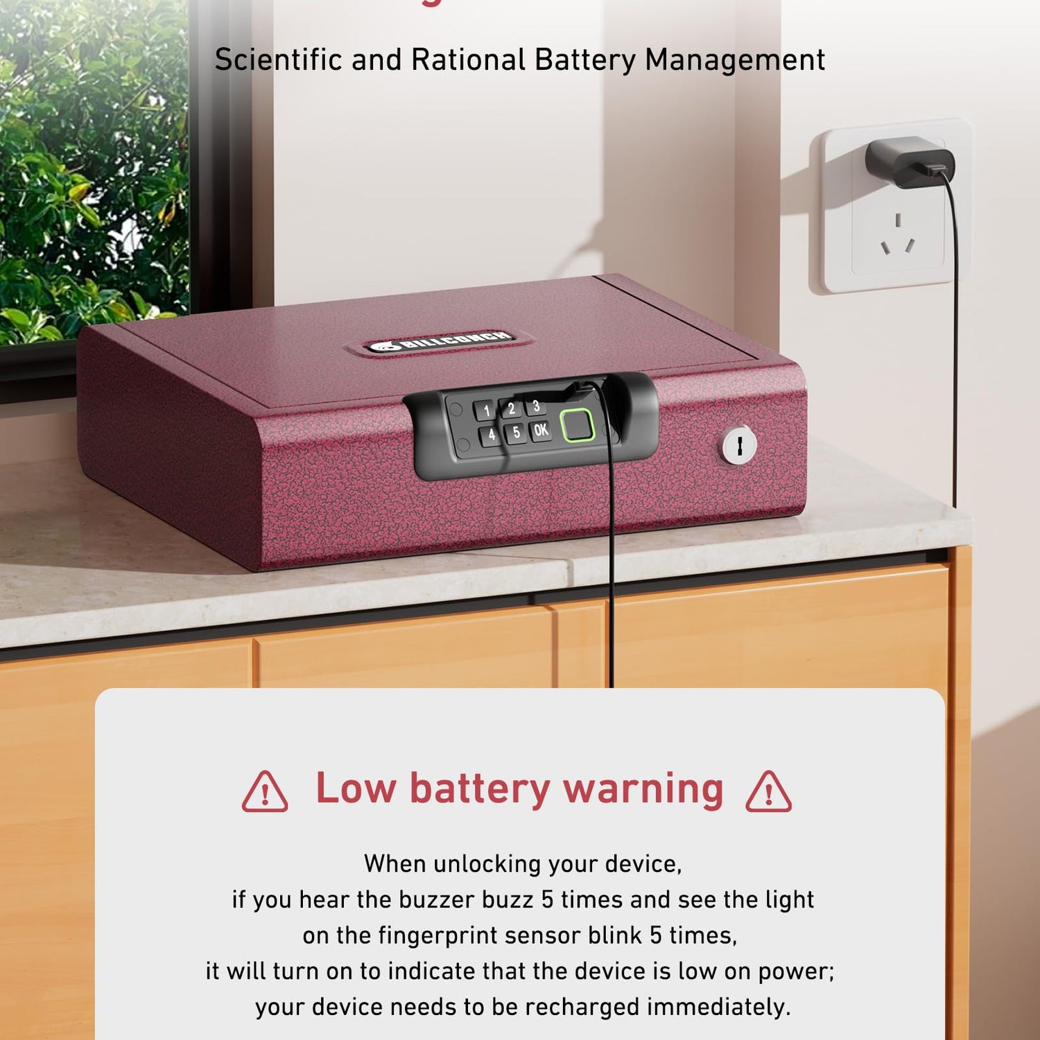 - USB CHARGE WITH LOW BATTERY REMIDER: The safe for pistol has a battery, can use USB cable to charge, and You can also use it as a power supply when it is out of battery,This handgun safe always keep danger away from your children