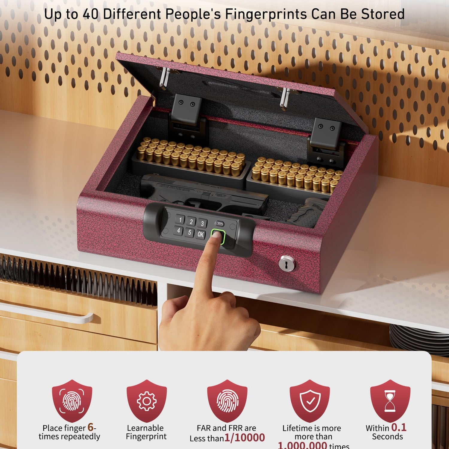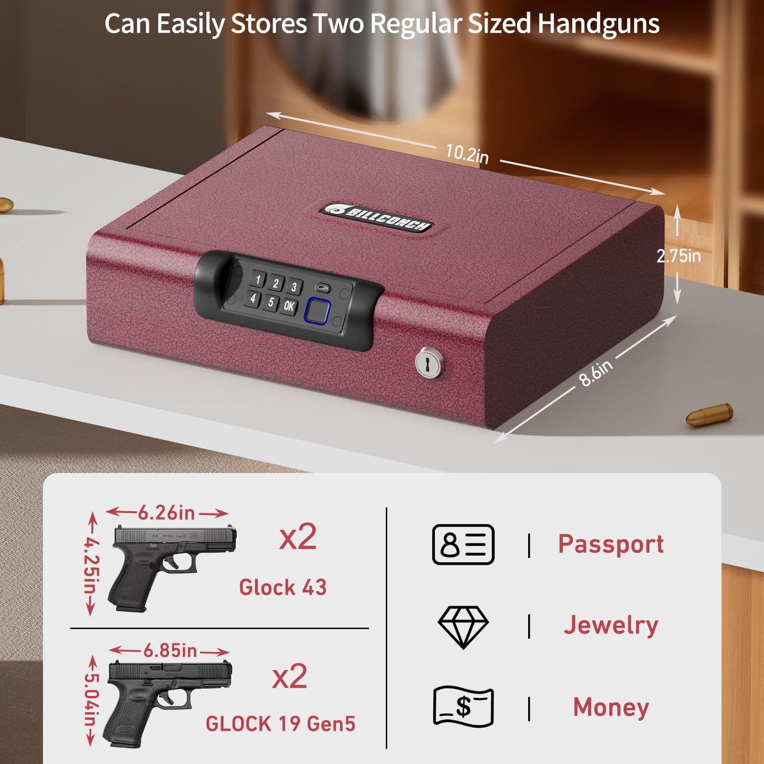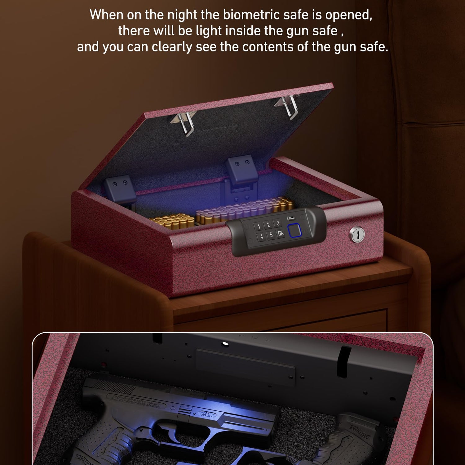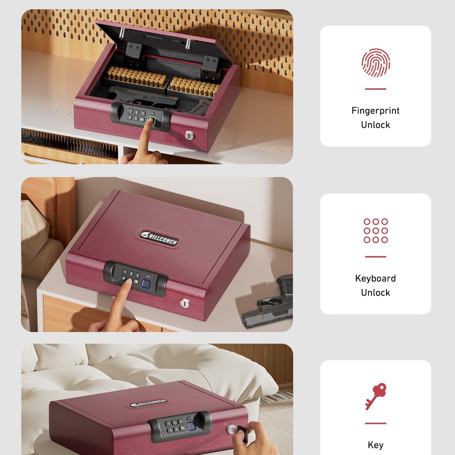 Gun Safe,Biometric Gun Safe for Pistols 3-Ways unlock Fingerprint Digital PIN Key Unlock with Sound, Lock box for Cloakroom living room Bedroom Nightstand and Car BILLCONCH - Burgundy Red