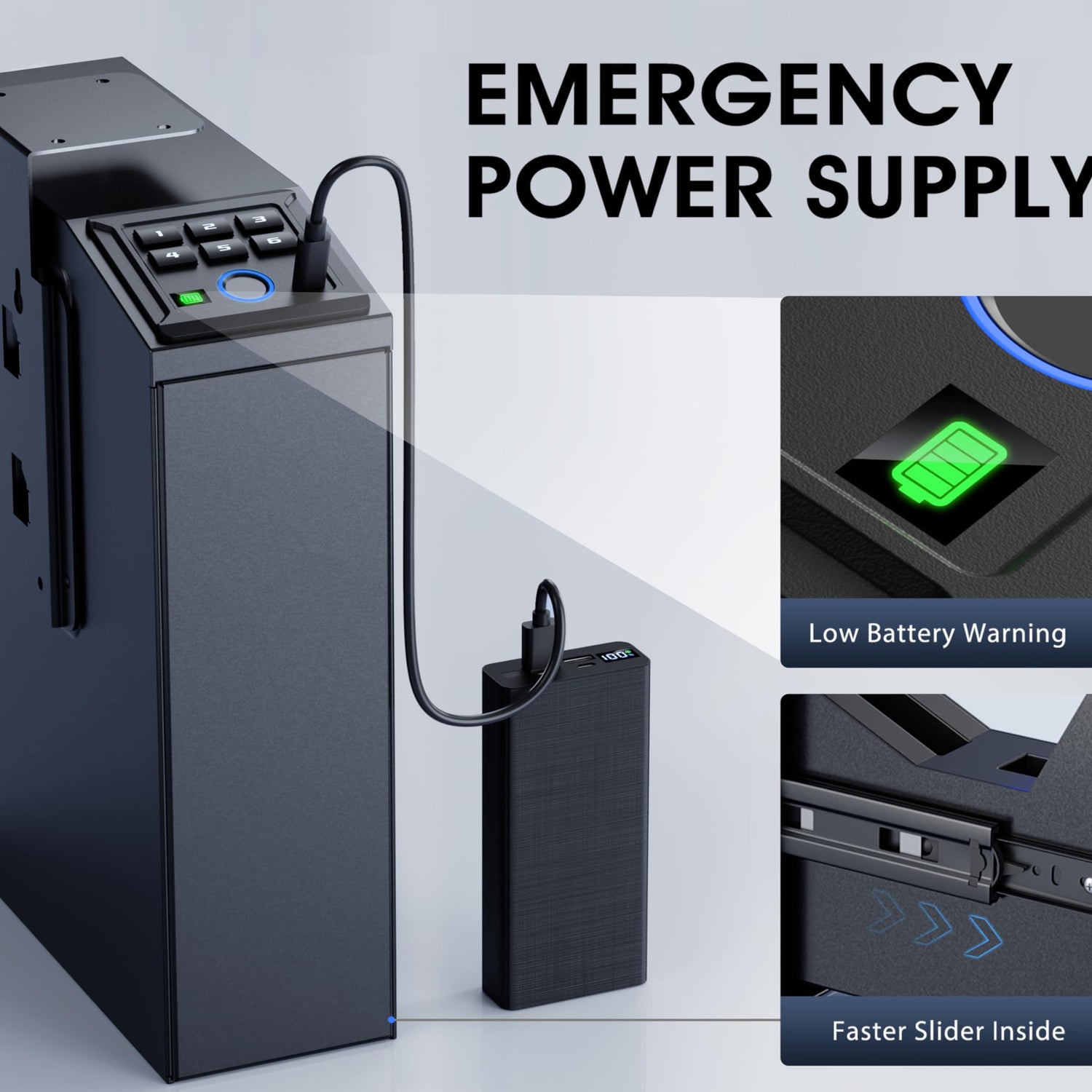 - 【Dual Power Options & Emergency Ready】Powered by long-lasting alkaline batteries or a Type-C emergency cable, this safe is always ready. The exterior battery compartment allows quick swaps without needing to open the safe, ensuring readiness when every second counts