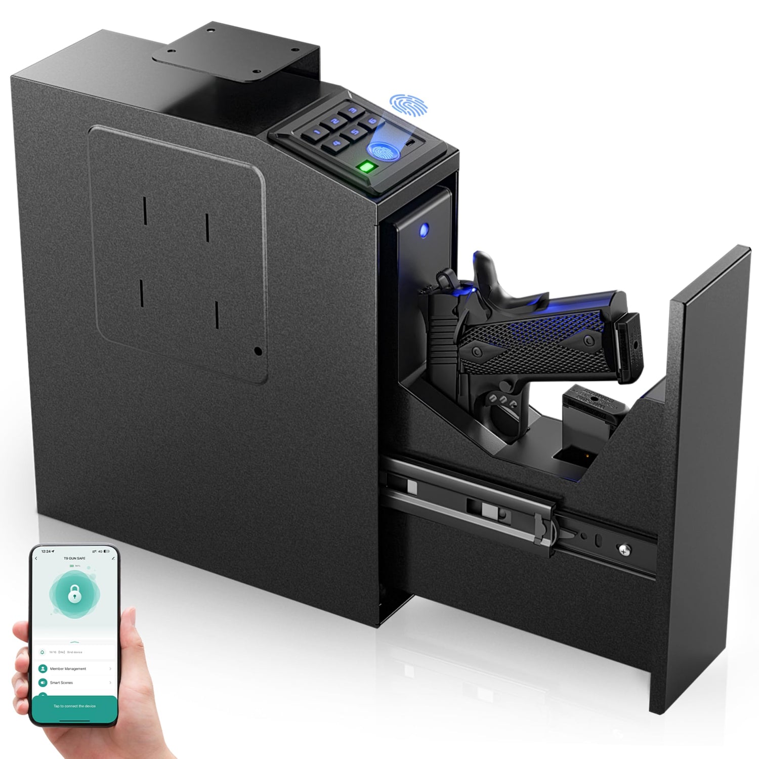 Gun safe, Biometric Slider safe for handgun, 4 Ways Unlock with Fingerprint, Key Access, PIN Code, Mounted Nightstand Pistol Safe and Gun Lock Box for Car, Truck, Desk, Bedside, Wall