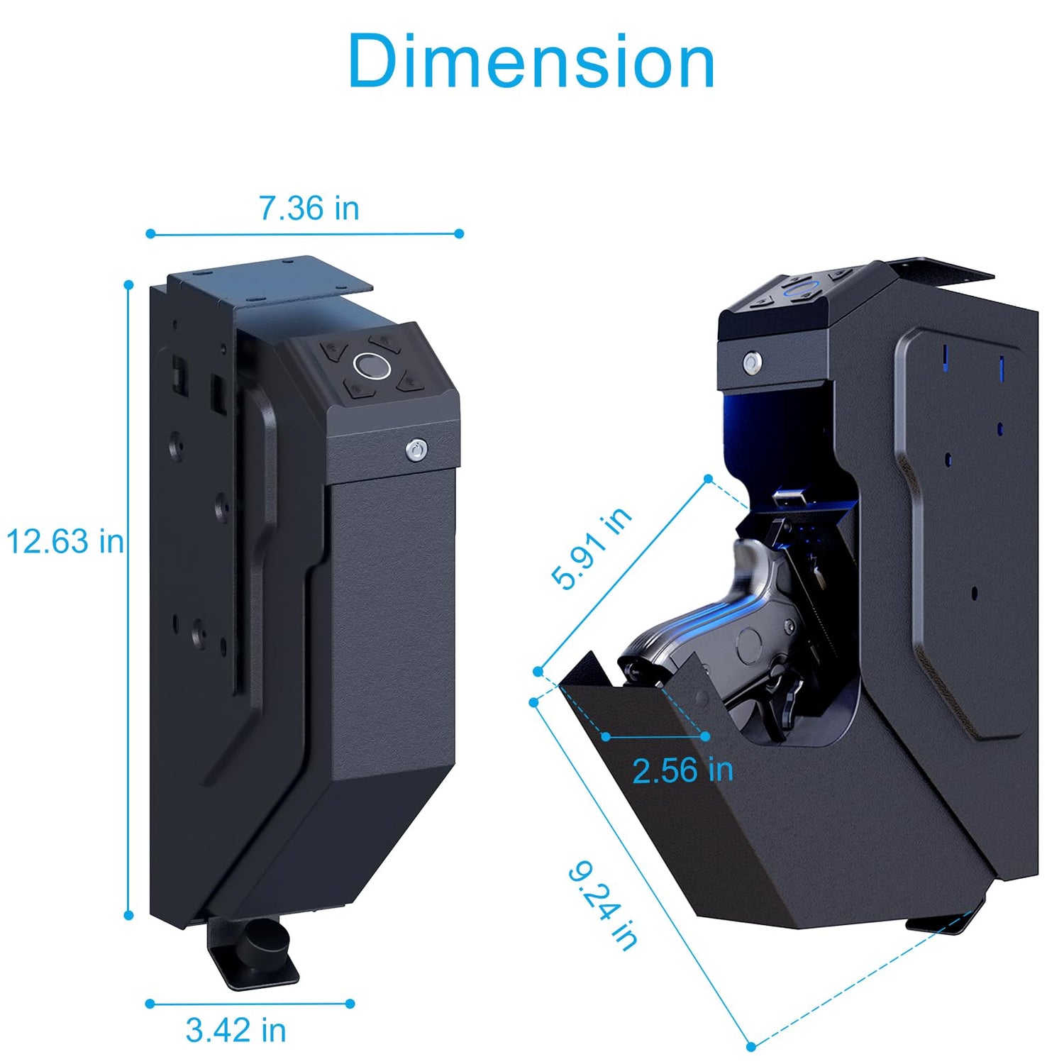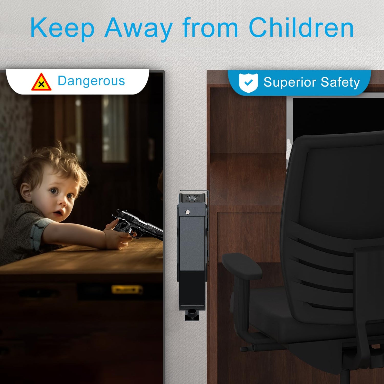 - Flexible Installation: With its unique drop-down design, this pistol safe can be mounted on the left or right, offering versatility to fit your space. Its compact size allows it to be discreetly tucked away in a desk, bookcase, or vehicle.