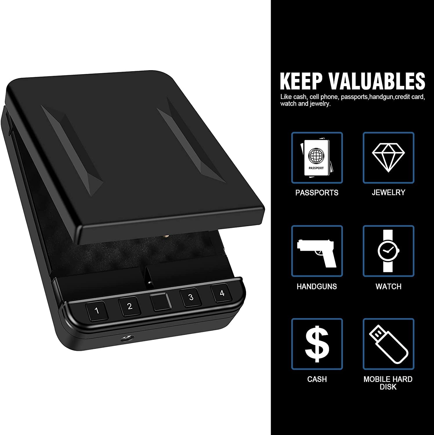 - 【PIN Code and Key ACCESS】This handgun safe has 4 key buttons and code is a 4-6 digit number, can offer quick set-up and easy operation, instant access to your valuables, firearms from the automatic opening door. Get in quick when it matters most using the key. Make sure keep emergency keys out of the safe in case the batteries dies.