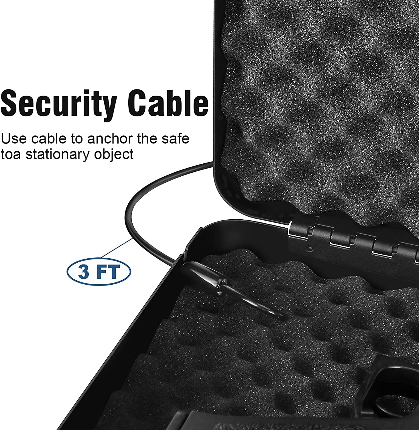 - 【PORTABLE CAPACITY & Security Cable】Exterior Dimensions : 11.8" x 7.5" x 2.3", Interior Dimensions 8.8" x 7.3" x 2.2". Weight : 5.5 pounds. Deluxe quick-access firearm safe for 1 handgun and some magnizines. Pre-drilled holes and hardware included for mounting.This safe has a portable size and weight,very suitable for your car,and carry it when you travel.