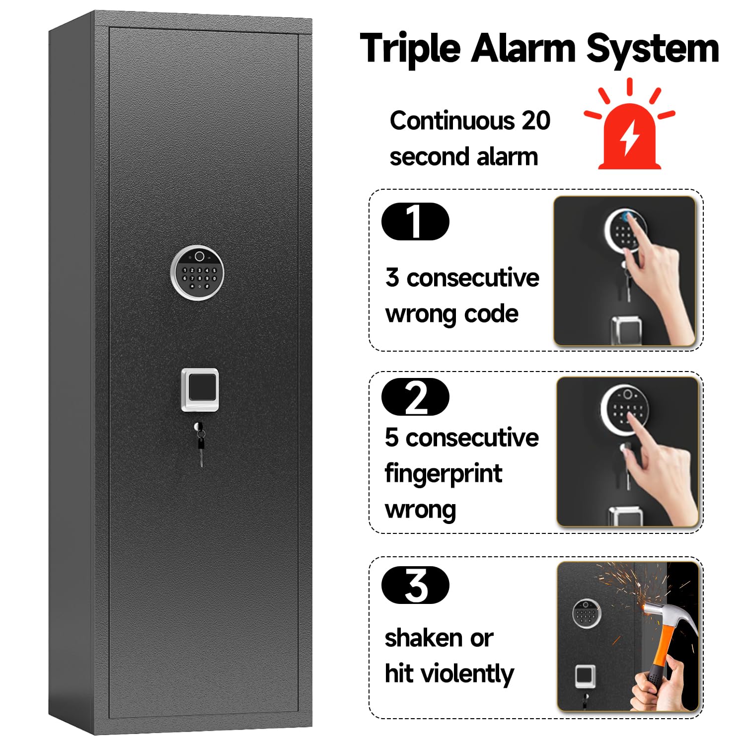 Details: Upgrade your home security with our Biometric Gun Safe for Rifles & Pistols — designed for fast access, reliable protection, and peace of mind. Built from heavy-duty solid steel, this large capacity gun cabinet holds 10–15 long guns plus handguns, with adjustable shelves to accommodate scopes, optics, and accessories. The advanced biometric fingerprint sensor unlocks in just 0.8 seconds, giving you instant access in emergencies while keeping firearms securely locked away from children and unauthorized users. For added security, you can use the keypad or backup keys as alternative entry methods. Unlike many safes that require hours of assembly, ours comes fully assembled and ready to use. Simply place it in your preferred location, secure it with the included anchor kit, and start protecting your firearms, ammo, and valuables. Perfect for garages, basements, and closets, this gun safe doubles as a multi-purpose home security locker — ideal for storing important documents, cash, jewelry, and electronics. Whether you’re a hunter, a sport shooter, or a responsible gun owner, this safe offers the right balance of speed, security, and convenience. Key Features: Biometric fingerprint access in 0.8 seconds Fits 10–15 rifles and pistols with adjustable racks Child-safe locking system to prevent unauthorized access Heavy-duty steel construction for long-lasting durability No assembly required — ready to use out of the box