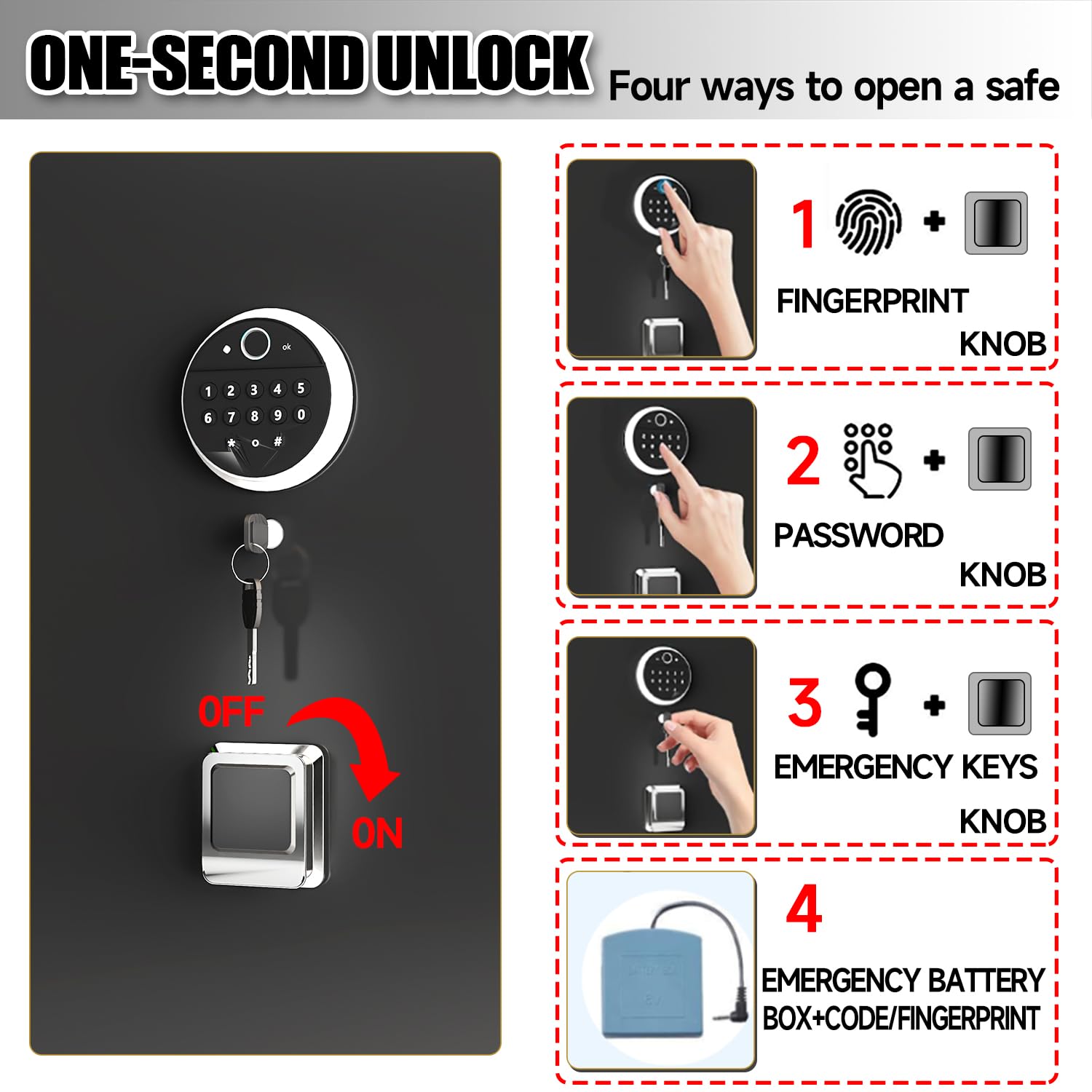 - Child-Safe Design – Keep Kids Away from Firearm Hazards Protect your loved ones by keeping firearms securely locked and inaccessible to children. The biometric + keypad dual locking system ensures only authorized users can open the safe.