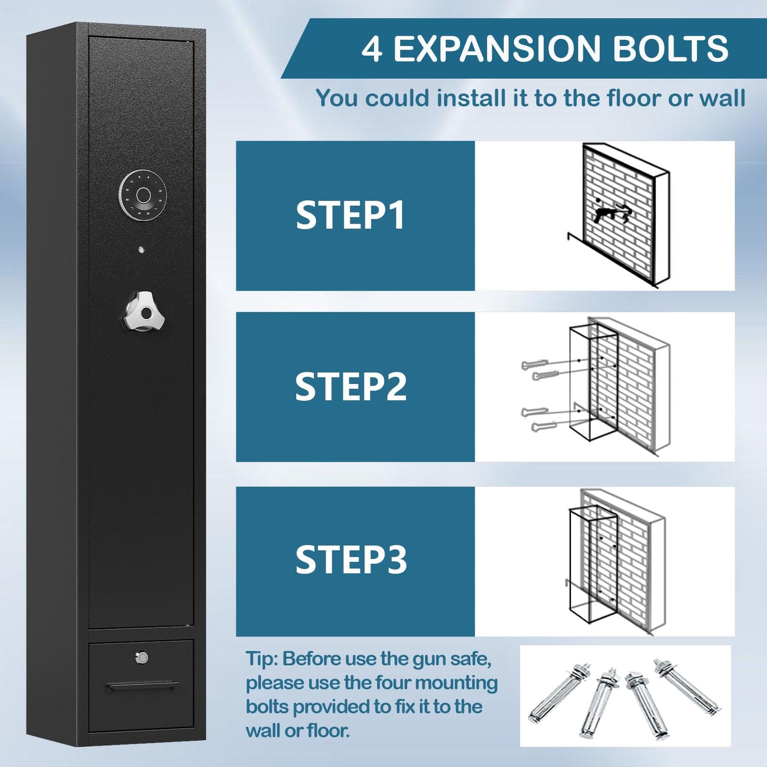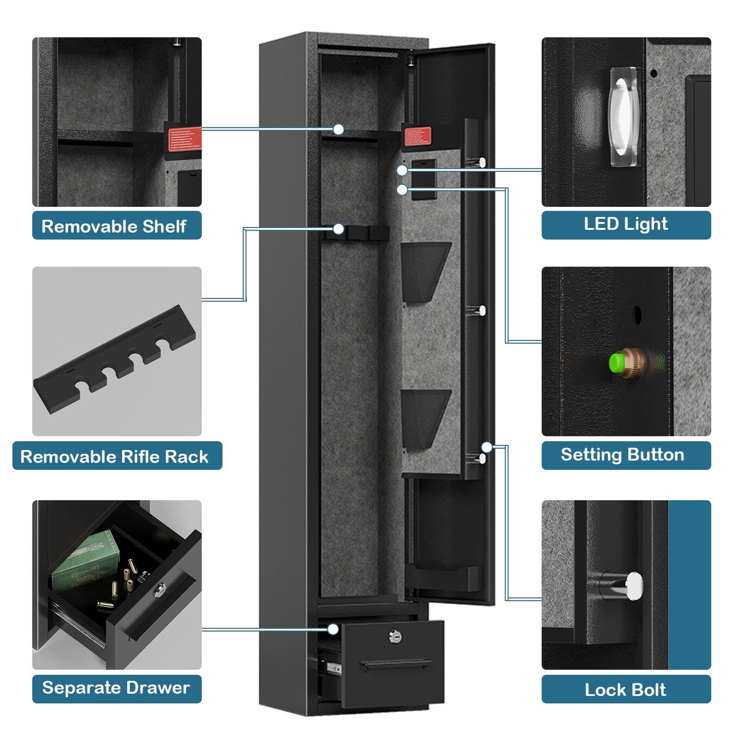- [Sturdy Gun Safe with Drawer]:This gun cabinets is made of cold-rolled steel with a thickness of 1.4mm. The thickness of the front door is 40mm, with three 20mm solid bolts,the gun safe will be stronger.The lockable drawer at the bottom of the rifle safe can store various items according to individual needs, such as gun accessories,cameras, documents,jewelry, bullets and other items.