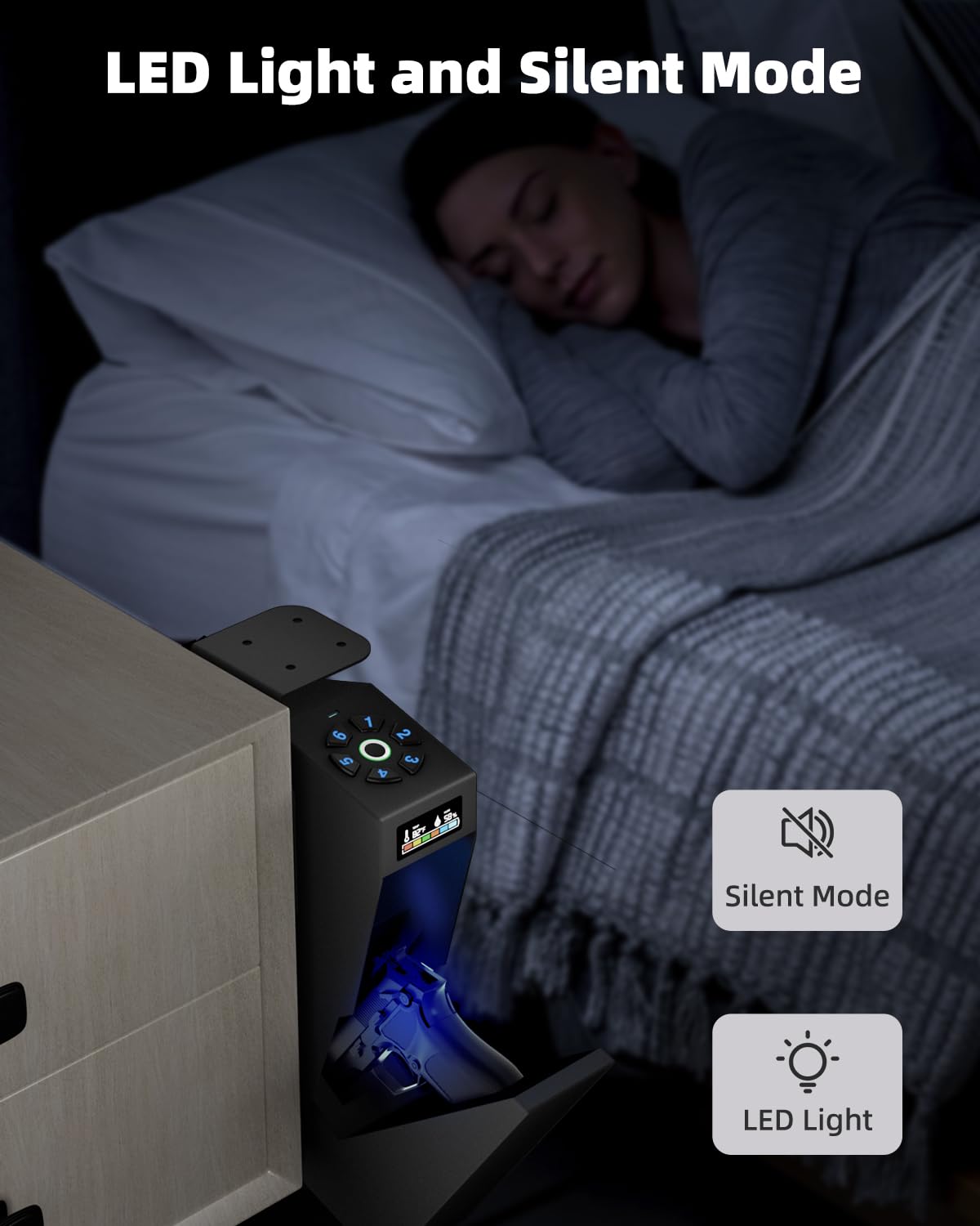 - LED Light & Silent Mode :The nightstand gun safe features an automatic LED light that illuminates the interior for 10 seconds upon opening, ensuring quick firearm retrieval. Enable silent mode to mute beeps, Perfect for emergencies while keeping your position concealed. bedside gun safe are a must-have gift for gun owners.