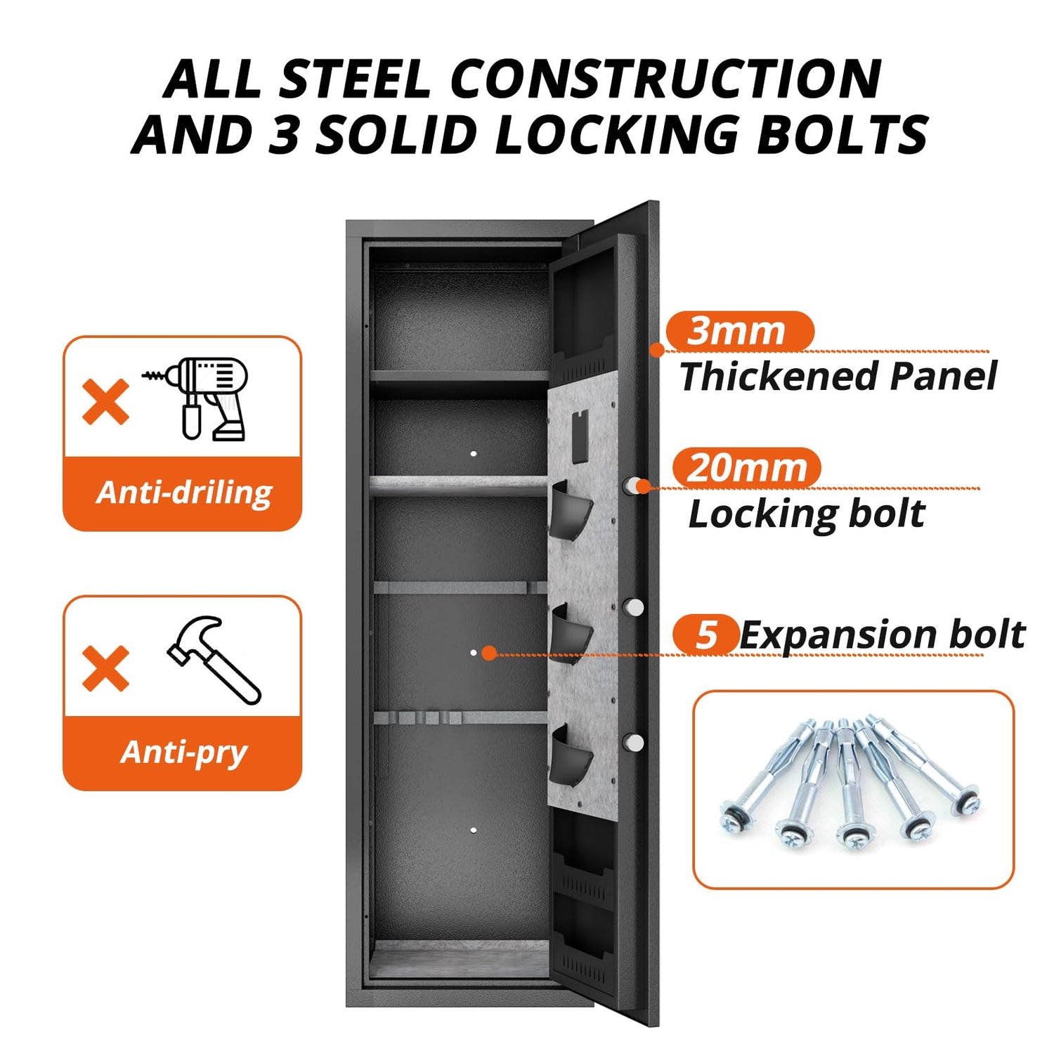 - 【Spacious 55" Tall Interior for 10+ Guns】 Fits rifles up to 55.1" (AR-15, shotguns) + 3 dedicated pistol holders. Multi-layer felt-lined shelves protect firearms from scratches. Extra storage for cash, jewelry & documents (17.7"W x 15.7"D).