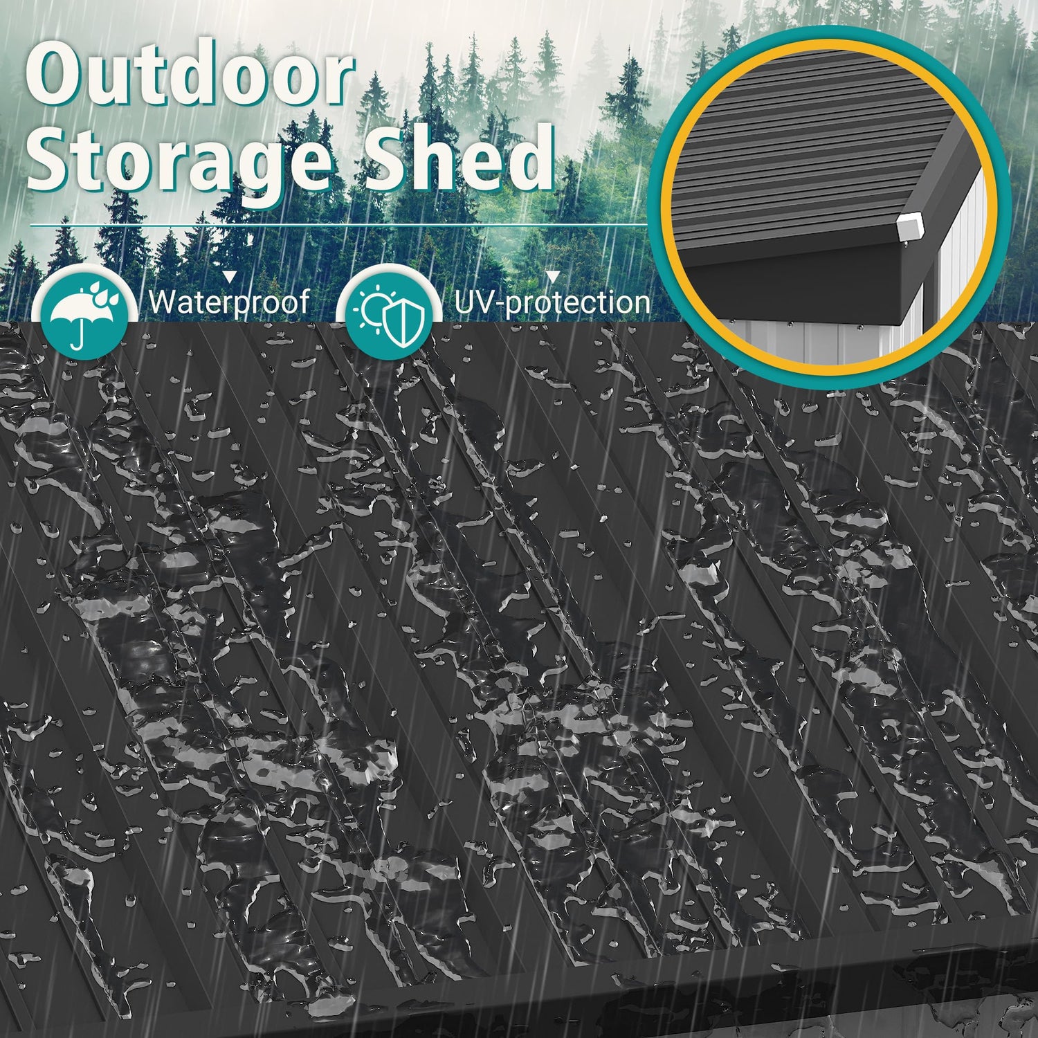 - Outdoor Shed: The material of the metal shed has strong rust and UV protection, whether it's heavy rain, hot sun, or snow, you don't have to worry about your outdoor shed. And the storage shed is designed with a lockable door, which improves the safety of outdoor use and prevents some small animals from accidentally entering.