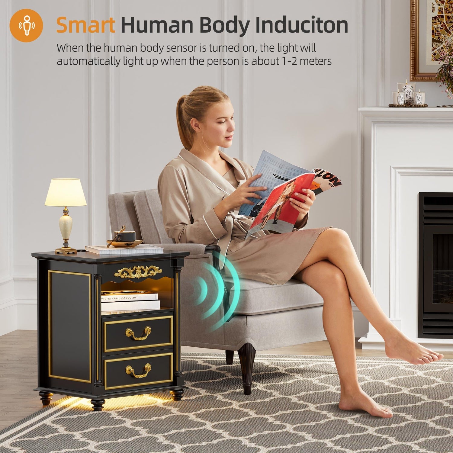 - 【LED 3 Colors & Auto Sensor Light】- The modern nightstand is designed with human sensor function that will automatically light up as you approach, guiding you in the dark. Besides, 3 LED colors can be switched and different brightness can be adjusted