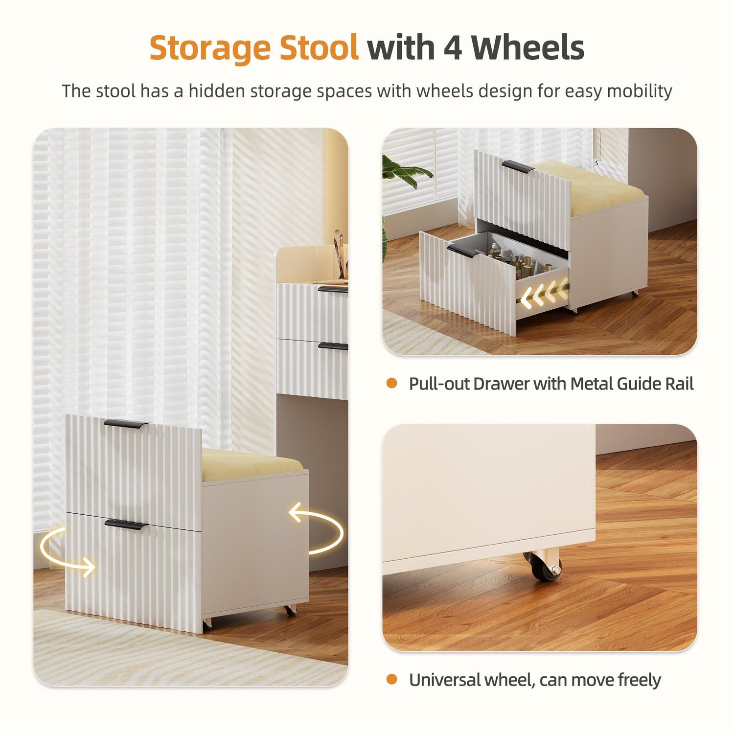 - 【Vanity Chair with Wheels】- A soft cushioned stool with 4 flexible wheels will give you a more comfortable makeup experience, under the stool is a large hidden drawer with metal silent slide rails, which can store our daily necessities
