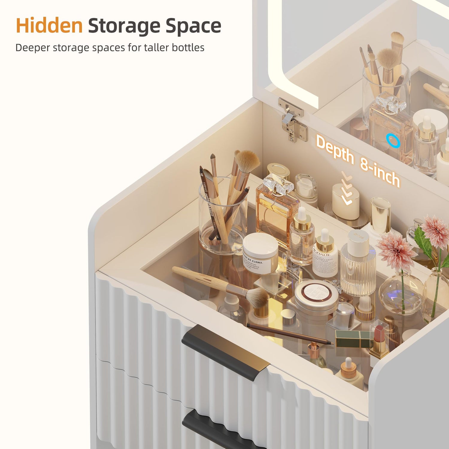- 【Spacious Storage Capacity】- Featuring three drawers (visible top drawer & hidden storage space for tall bottle) and an extra drawer under the chair, this mini vanity provides plenty of space for your cosmetics, brushes, and other beauty essentials
