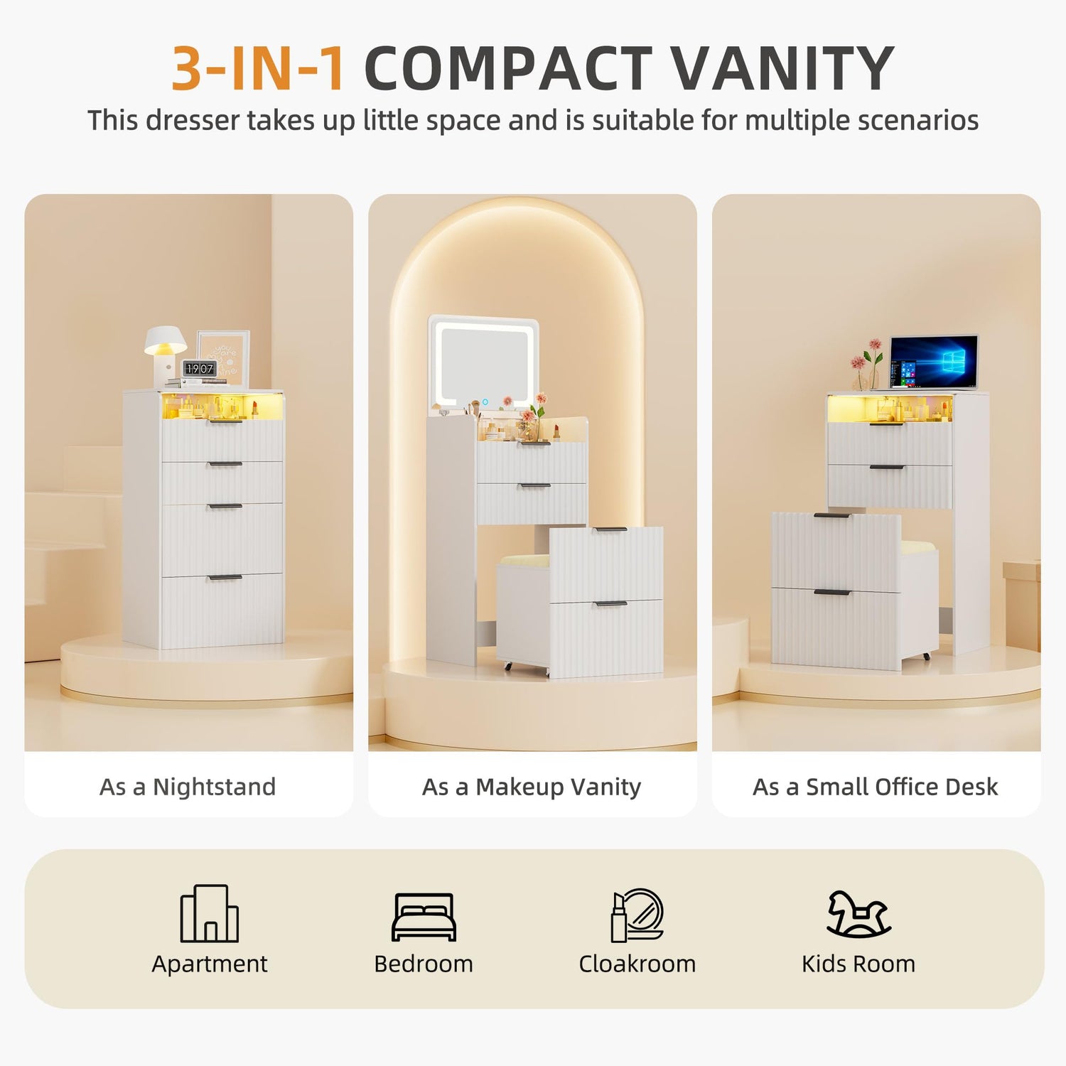 Gurexl Fluted Small Vanity Desk with Mirror and Lights, 3-in-1 Compact Makeup Vanity Set with Hidden Storage Stool, Mini Dressing Table with 3 Drawers, Gift for Little Girls/Kids (White)