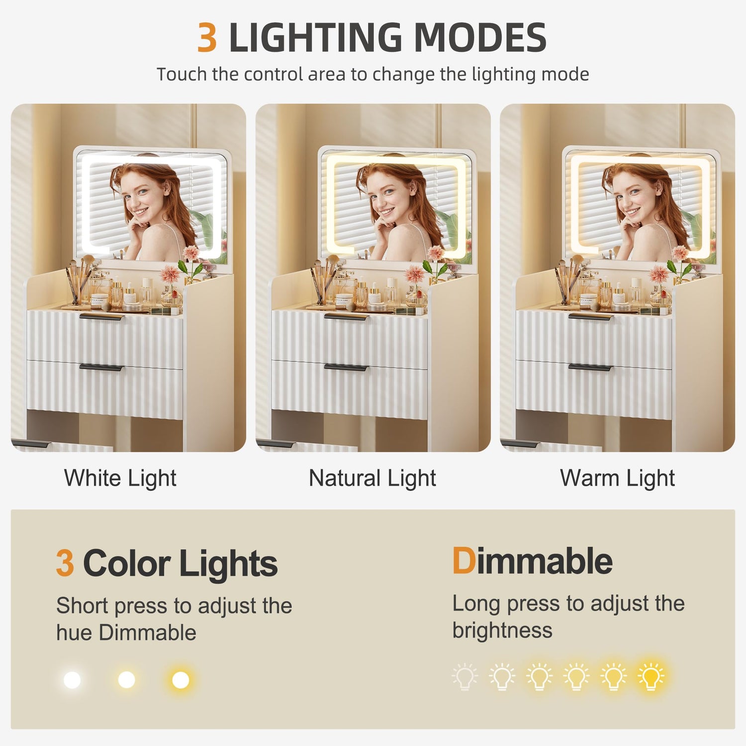 - 【Vanity Set with 3 Colors Lights】- The lighted vanity table comes with HD flip top mirror with 3 modes (warm, natural, cold white), adjusting the brightness according to different scenes and makeup needs by long pressing the smart touch button