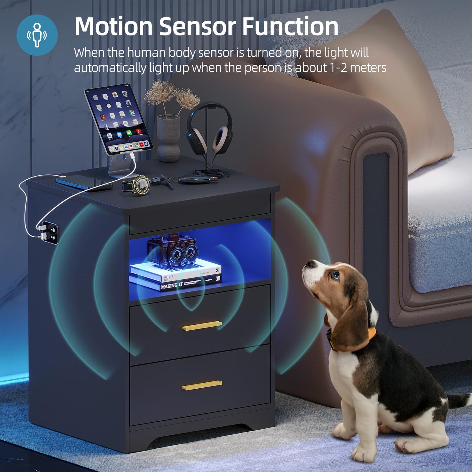 Gurexl LED Nightstand with Gun Drawer, Modern Beside Table with Charging Station, Auto Sensor 3 Color Dimmable Night Stand with Open Compartment for Bedroom