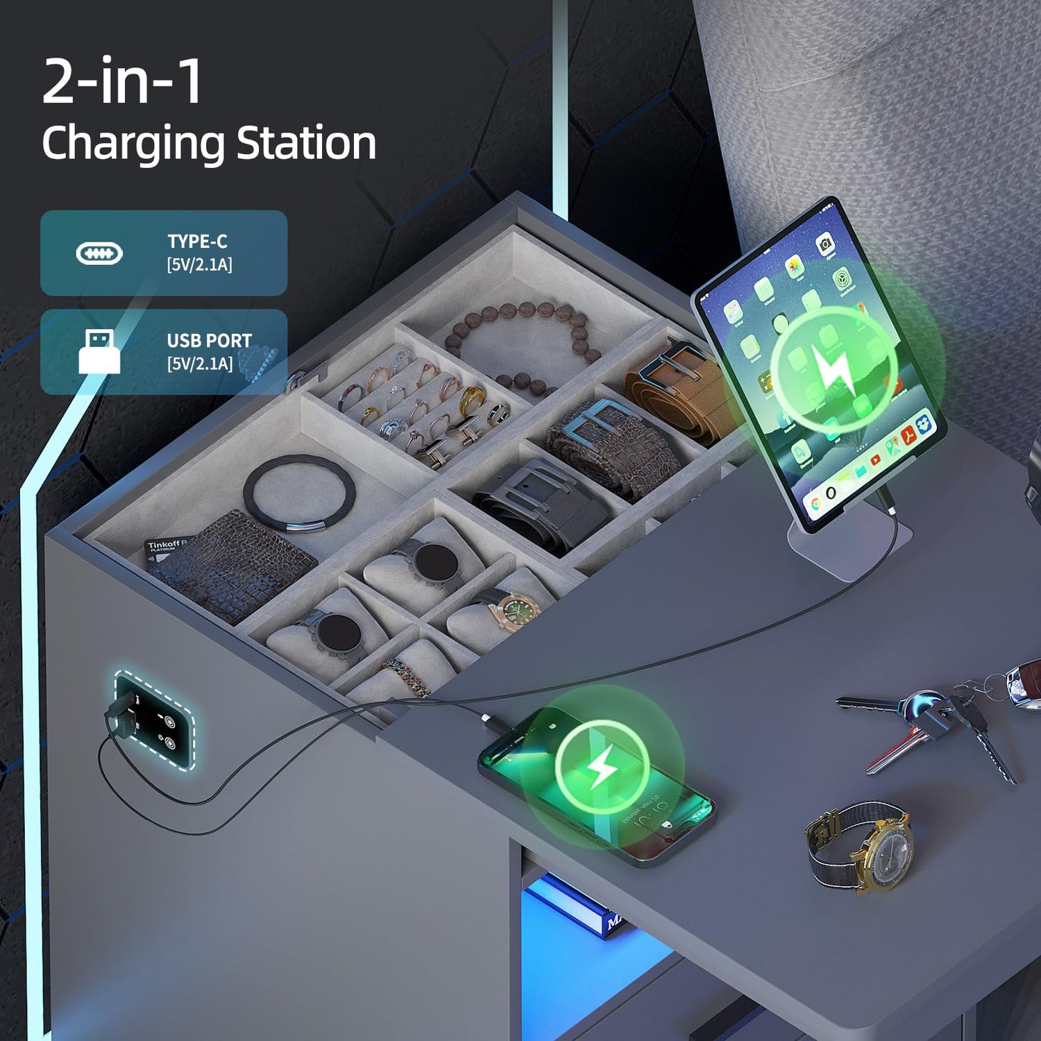 Gurexl LED Nightstand with Gun Drawer, Modern Beside Table with Charging Station, Auto Sensor 3 Color Dimmable Night Stand with Open Compartment for Bedroom (Grey)
