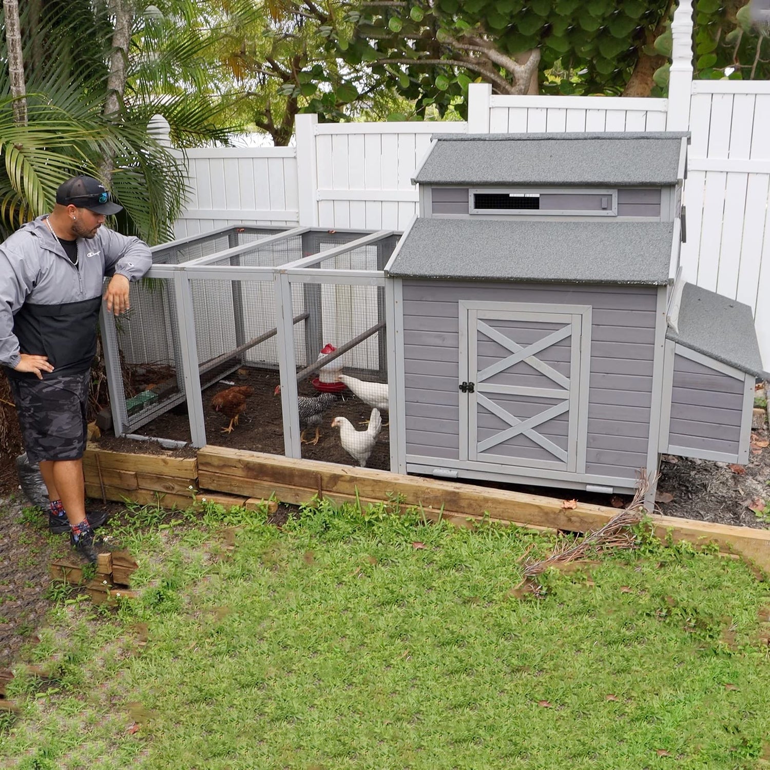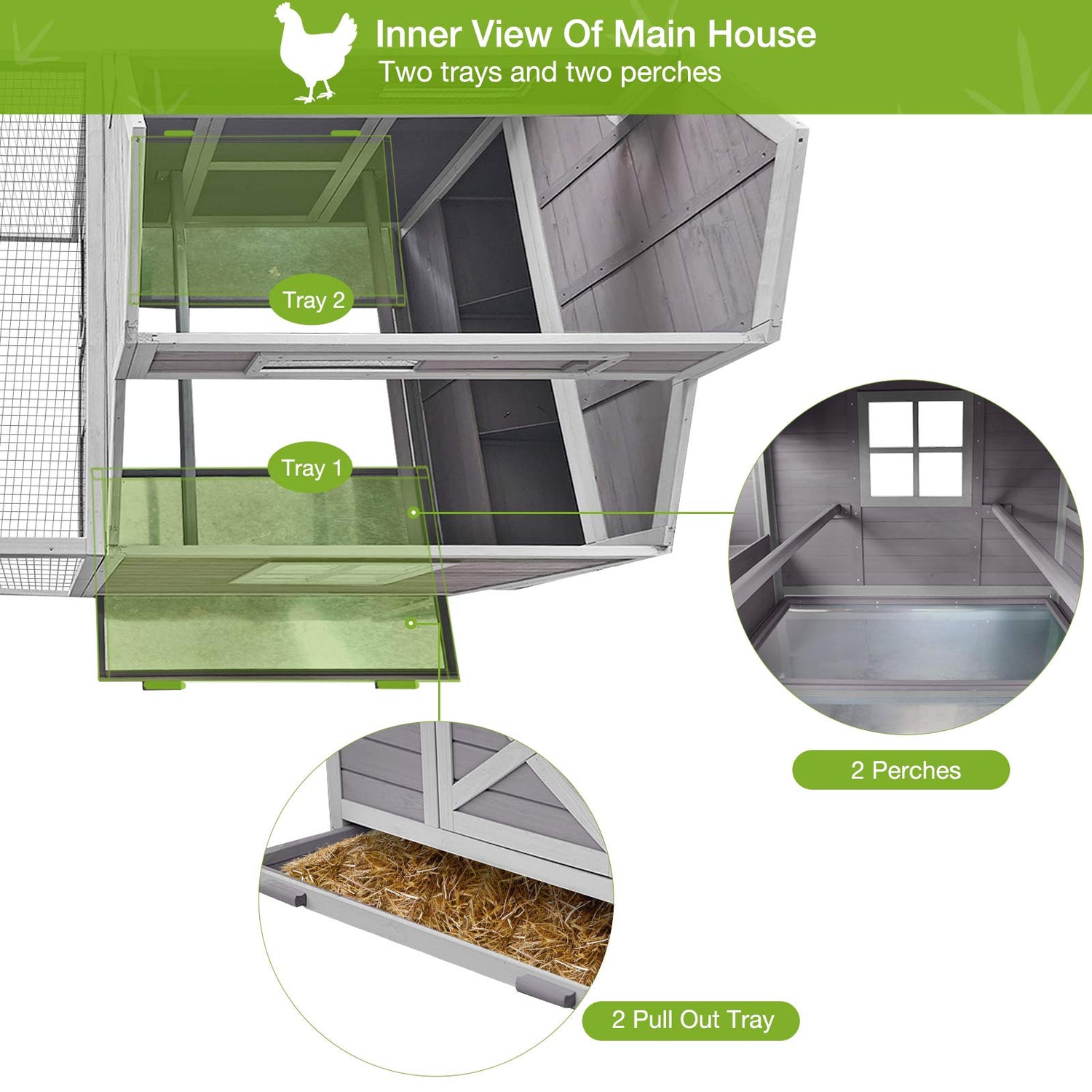 - 【EASY TO CLEAN】Two large metal tray built in the chicken coop can be pulled back and forth for easy cleaning.Easily reach all areas of the hen coop with 4 access areas.