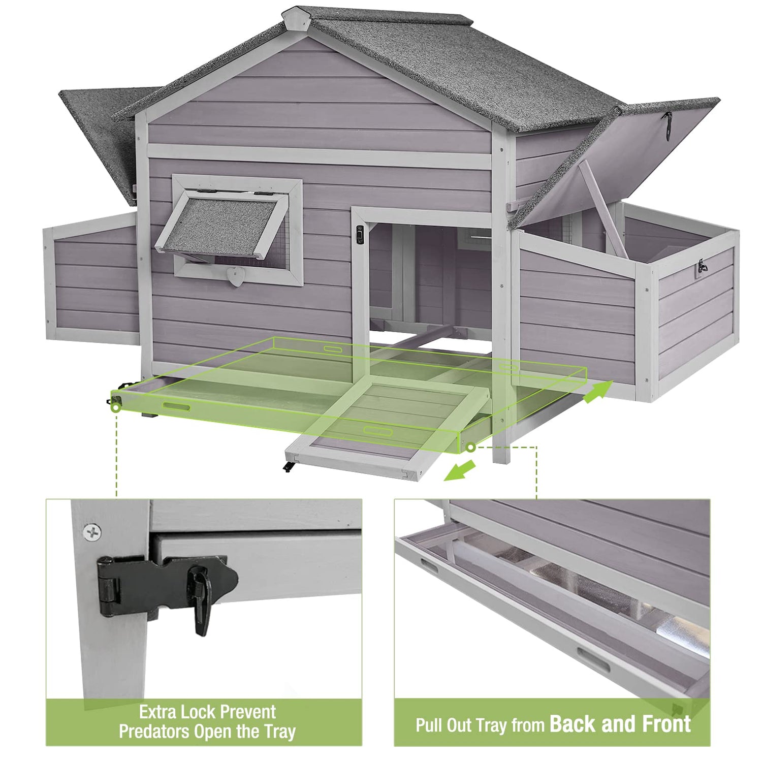 - 🐣 【EASY TO CLEAN】: Comes with a removable sliding tray for easy cleaning, and a metal wire fencing for ventilation. Easily reach all areas of the coop with 4 access areas.