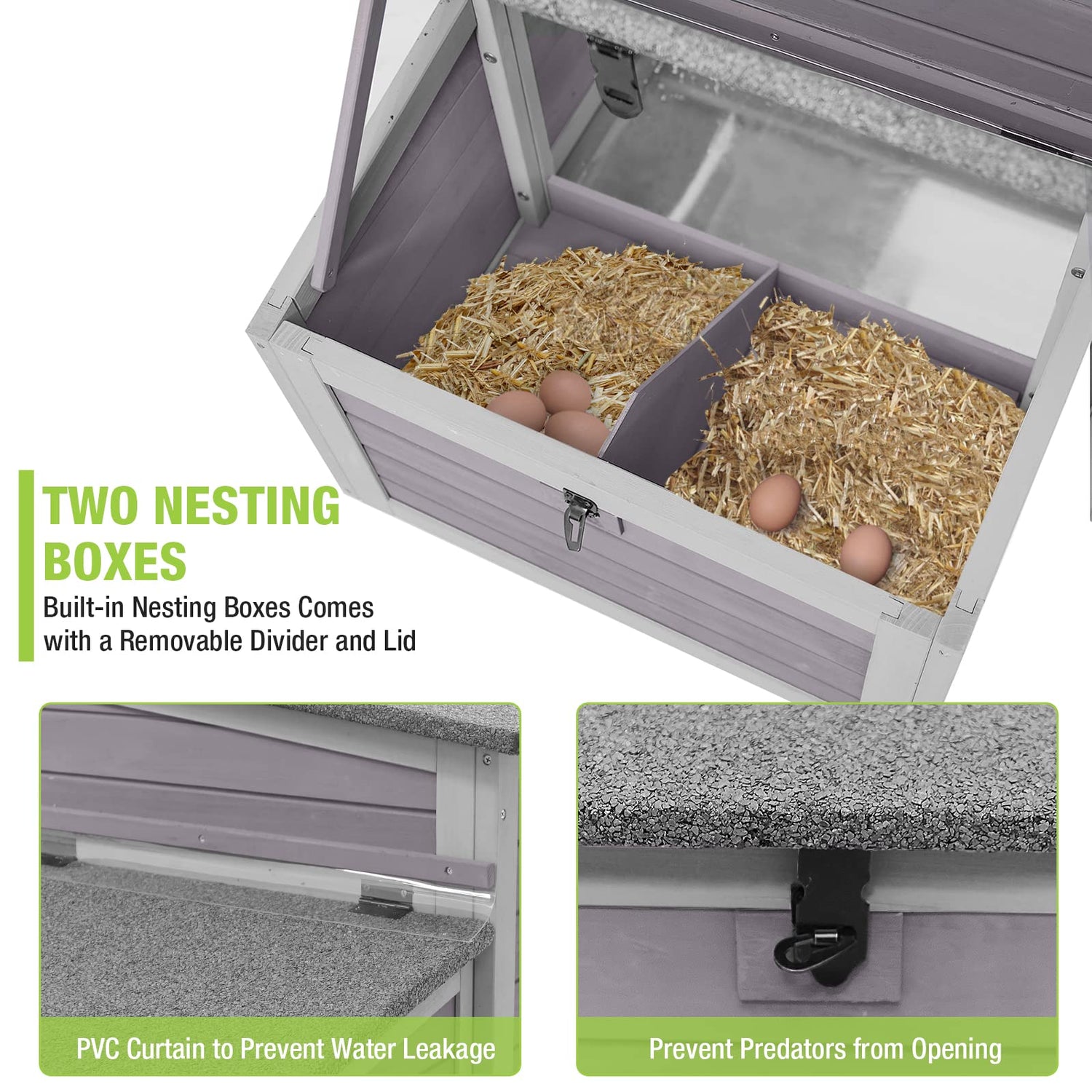 - 🐣 【NESTING BOXES】LARGE 2 sides nesting box provide a spacious and comfortable delivery Room, PVC cover above the connecting of nesting box to prevent leakage.