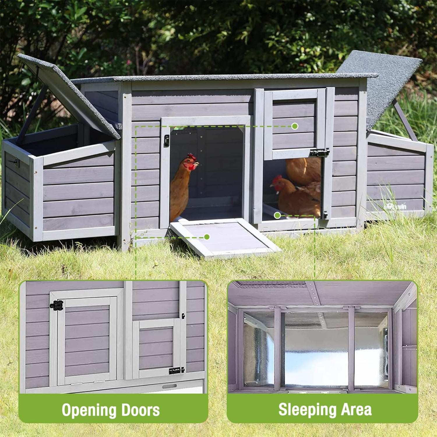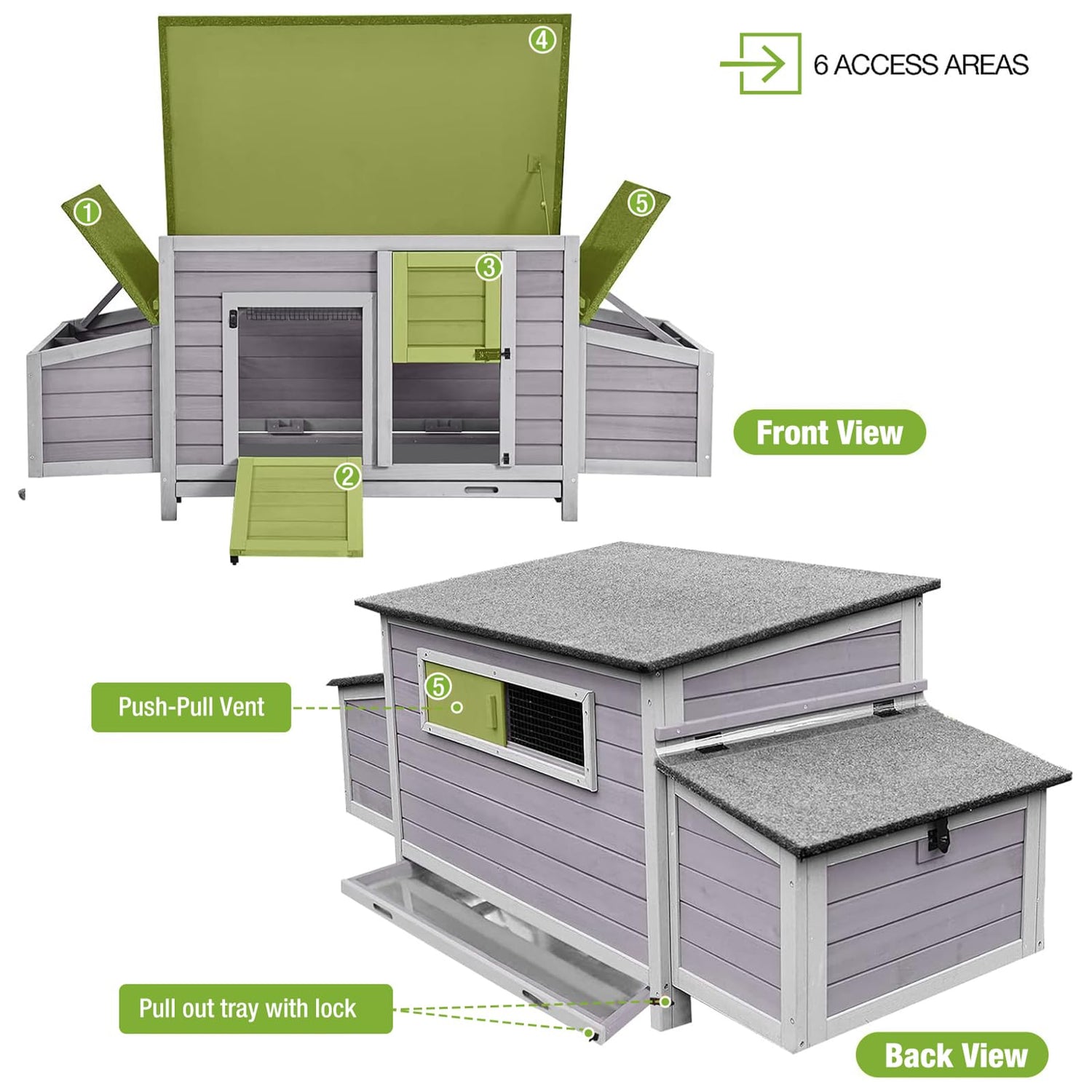 - 【Easy Cleaning】The outdoor chicken coop has 5 access areas and a big pull out tray is more convenient to clean the poultry house.Wire fencing ensures good ventilation.