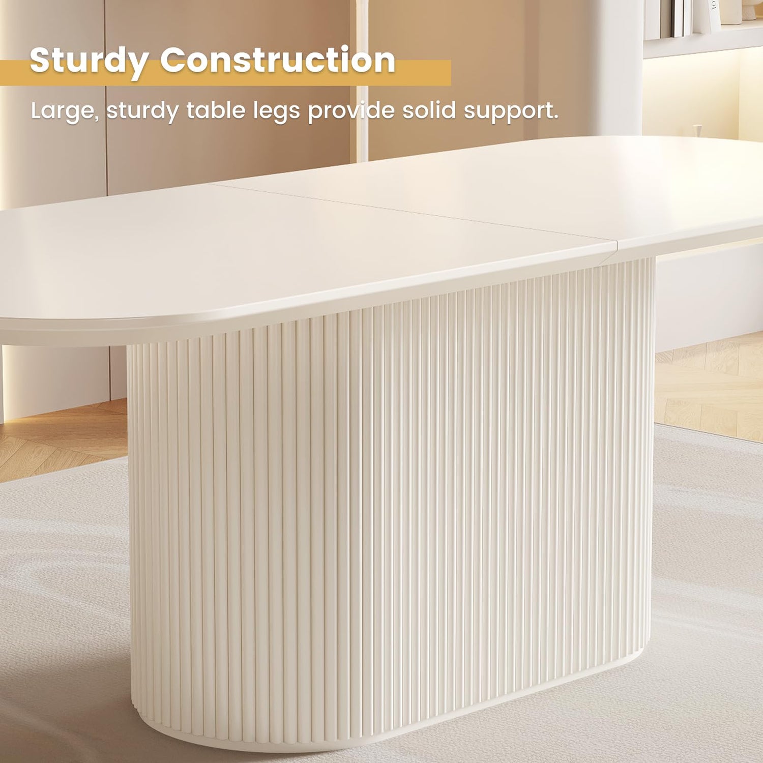 - Sturdy and Unique Oval Base: Our cream white oval dining table features a robust and aesthetically pleasing design with its elongated oval-shaped legs, measuring 43.93 inches in length. These sturdy pillars not only provide a strong visual statement but also boast exceptional load-bearing capabilities, ensuring the table can comfortably support substantial weight without compromising stability