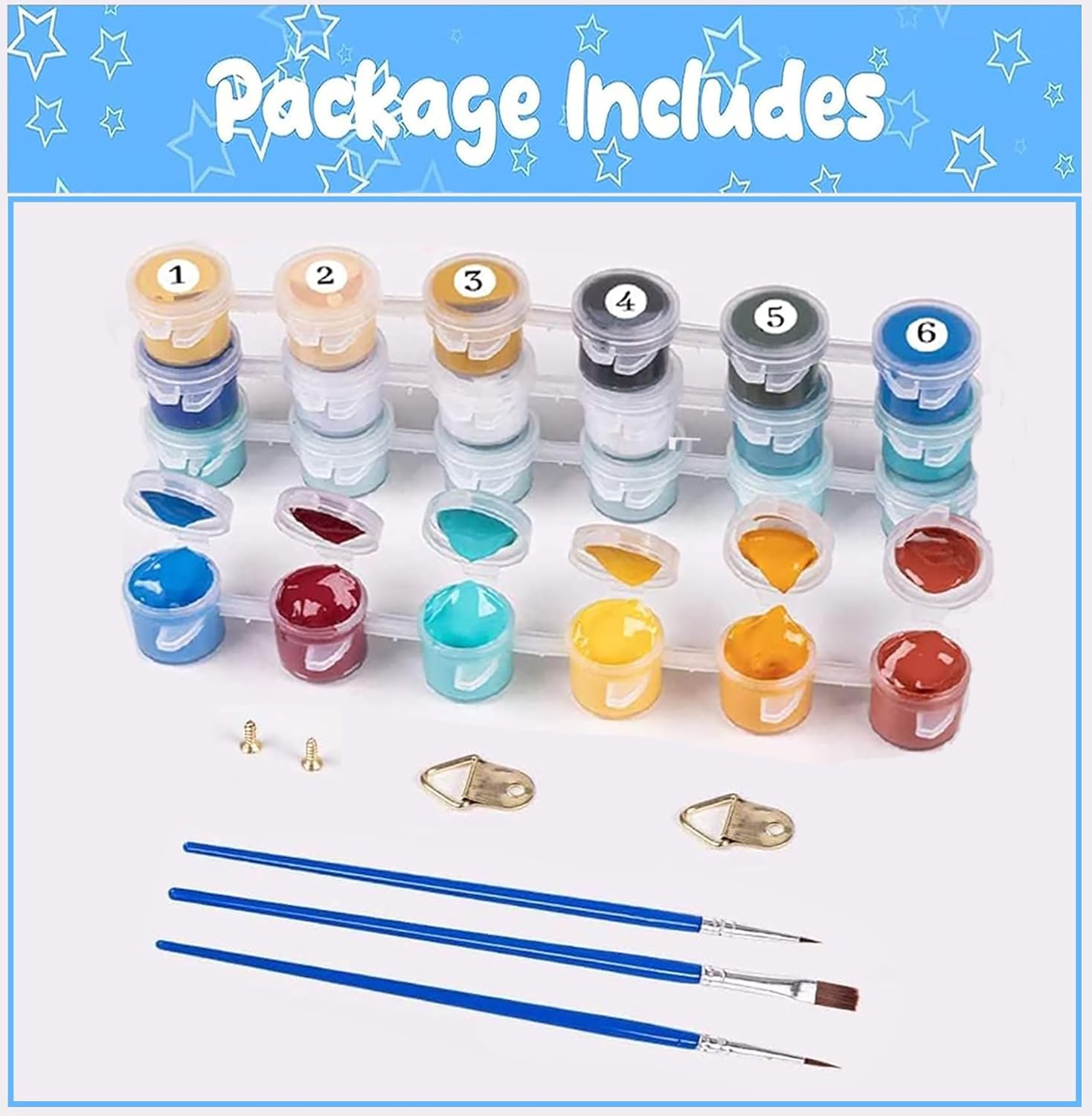 1.This is a beautiful adult paint by number kits,Include 1*canvas (without frame), 1 set of high-quality acrylic paint, 3 pcs brushes, 1 paper copy of numbered canvas for reference, 1 color postcard guide, 2* Wall-Mounted Hooks and Screws,kids paint by number kits age 4-5-8-12,rich styles and dazzling motifs will make children love for him