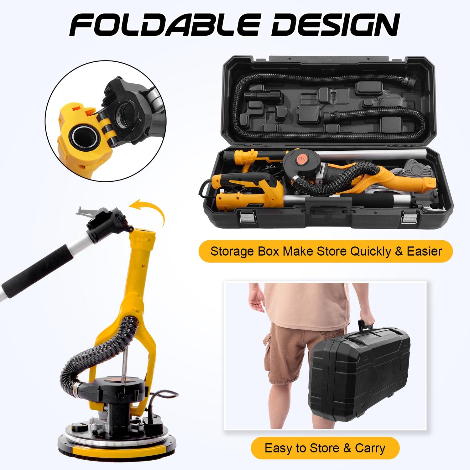 • Automatic Dust Collection System: The drywall sander adopts an automatic dust collection system, equipped with a 6.5ft/2m dust collection tube and a 28L dust collection bag. The powerful suction can collect and transport the dust during sanding to the dust collection bag, It can greatly reduce the dust generated during work and make your subsequent cleaning work simpler and easier. At the same time, it also equipped with a vacuum cleaner connector that can be connected to most vacuum cleaners.
