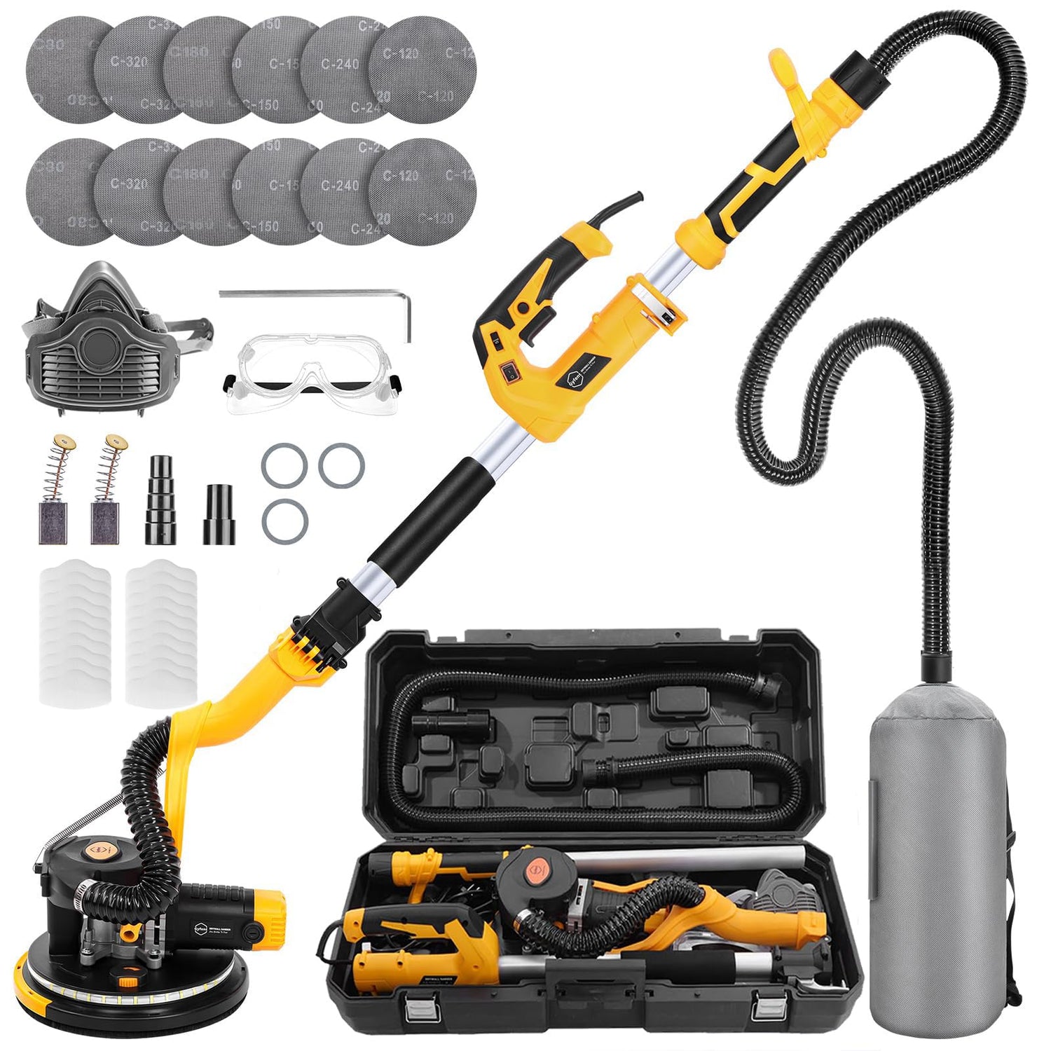 • Package Includes: You will receive a 7.3-Amp drywall sander(26ft power cord), 2pcs carbon brushes, 1pcs 6.5ft dust collection tube, 1pcs 28L dust collection bag, 1pcs hexagonal wrench, 12pcs sandpapers (80/120/150/180/240/320*2), 1pcs 35 connector, 1pcs pagoda connector, 3pcs metal gaskets, 1pcs goggles, 1pcs earmuffs, 1pcs dust mask, 20pcs cotton piece, 1pcs storage box and 1pcs instruction manual.