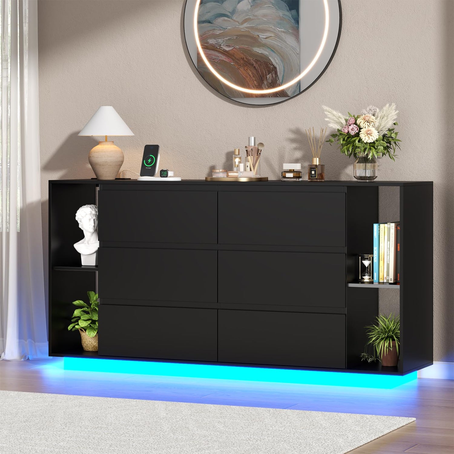 - [Integrated Charging Station] Experience the perfect blend of style and modern convenience with our led dresser upgraded with a built-in charging station. Whether it's your smartphone, tablet, or smartwatch, you can ensure they're always charged and ready to go. This practical addition transforms the dresser from a simple storage solution into a hub of organization and connectivity.
