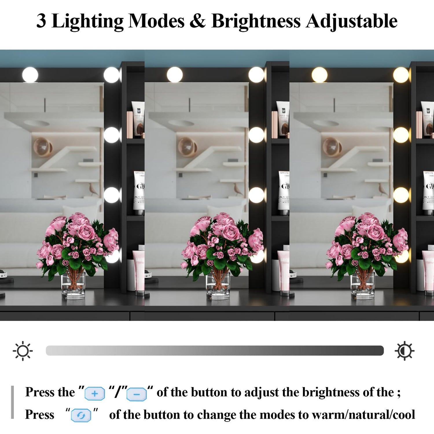 - ENHANCED DESIGN WITH LARGE VANITY MIRROR AND LIGHTS - With 10 surrounding light bulbs, this vanity mirror offers ample illumination for your dressing area. It features three light mode settings (white, warm, cool) to highlight your skin tones and colors. The mirror also includes a dimming feature, allowing you to adjust the brightness according to the indoor lighting conditions.
