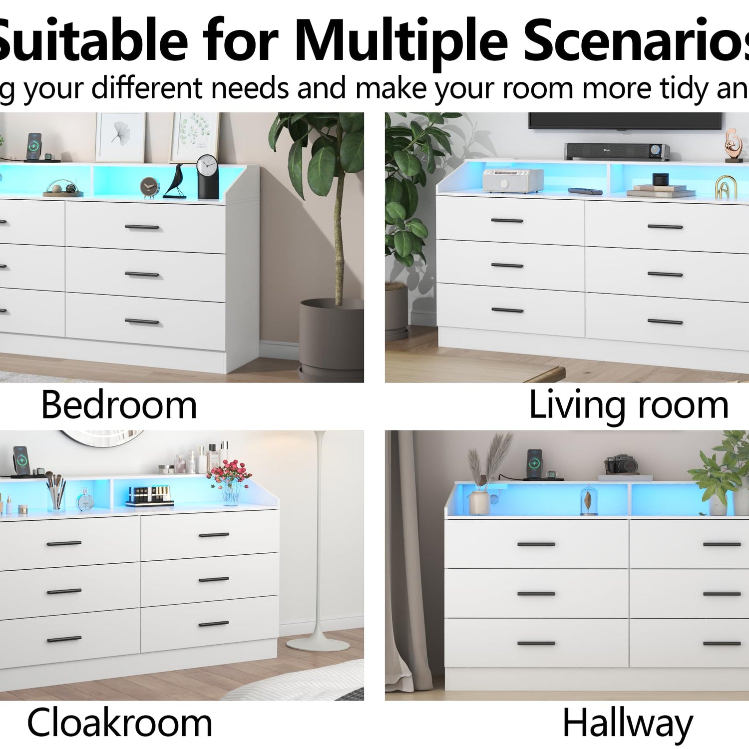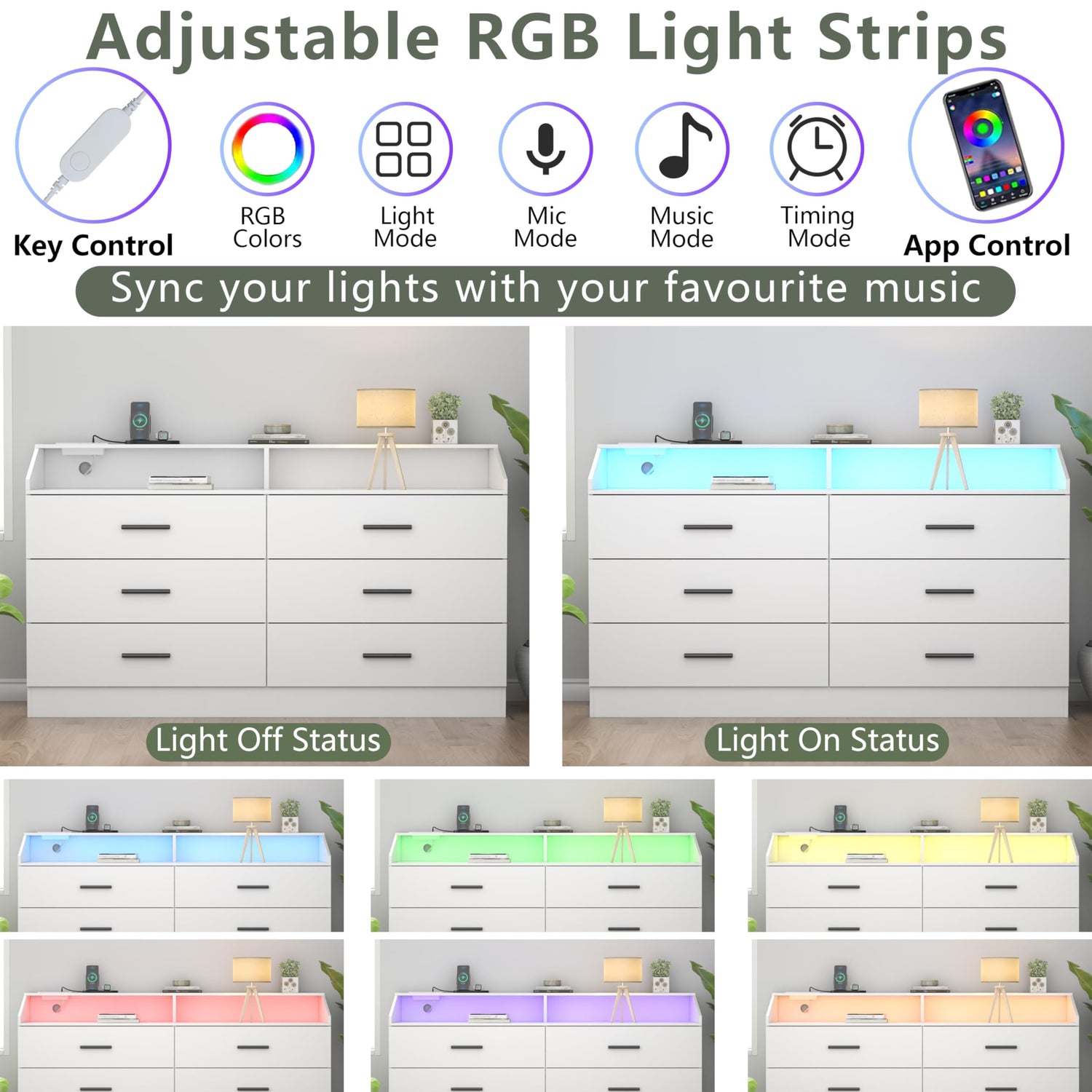 - ๐๐๐ฎ๐ข๐ฅ๐ญ-๐ข๐ง ๐๐ก๐๐ซ๐ ๐ข๐ง๐ ๐๐ญ๐๐ญ๐ข๐จ๐ง & ๐๐๐ ๐๐ข๐ ๐ก๐ญ: This white dresser features a power outlet, which makes it convenience to cahrge devices. It has 2 AC outlets and 2 USB ports, so you can charge your electronic devices without the need for an additional charger. And this modern bedroom furniture with an adjustable LED light. You can freely adjust the colors, modes, brightness, and so on through the key button or App. Create a different atmosphere for your room and make it look unique.