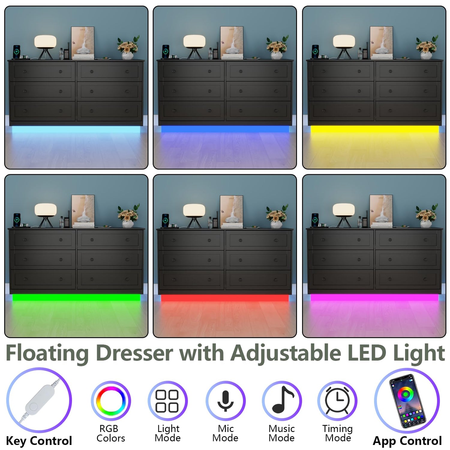 Gyfimoie 6 Drawer Dresser with Power Outlet and LED Light, Modern Floating Storage Dresser for Bedroom, Living Room