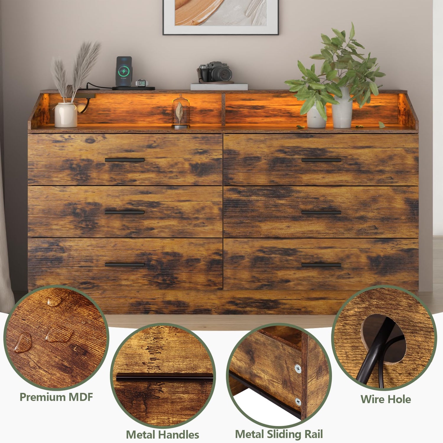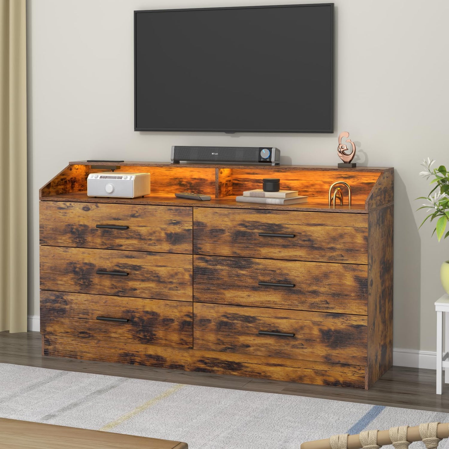 Gyfimoie 6 Drawer Dresser with Power Outlet, Chest of Drawers with LED Light, Modern Dresser with Open Storage Cubby, Double Wide Dresser Organizer for Bedroom, Living Room, Entryway, Hallway