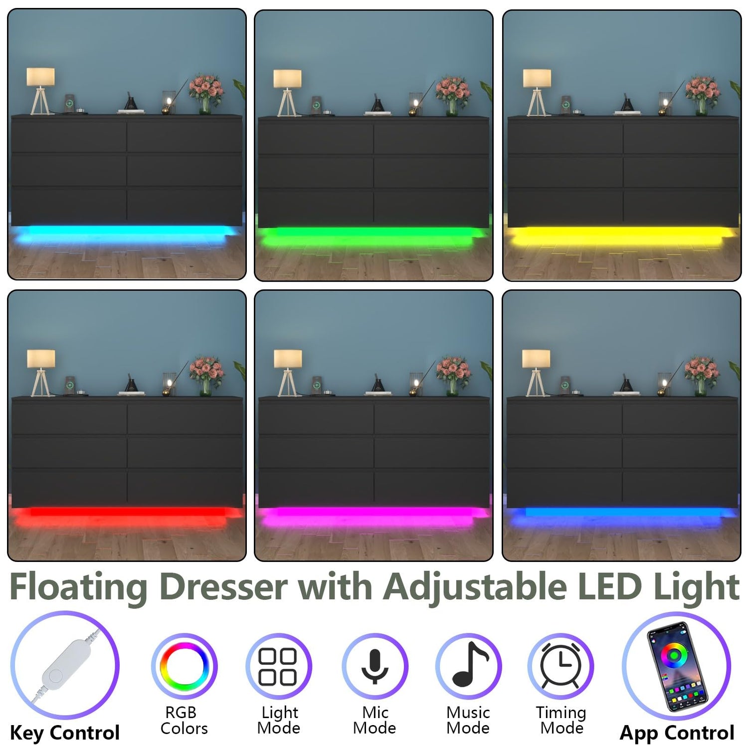 Gyfimoie 6 Drawer Dresser with Power Outlet, Floating White Dresser Chest of Drawer with LED Light,Modern Double Wide Drawer Organizer Cabinet for Bedroom,Living Room (Black)