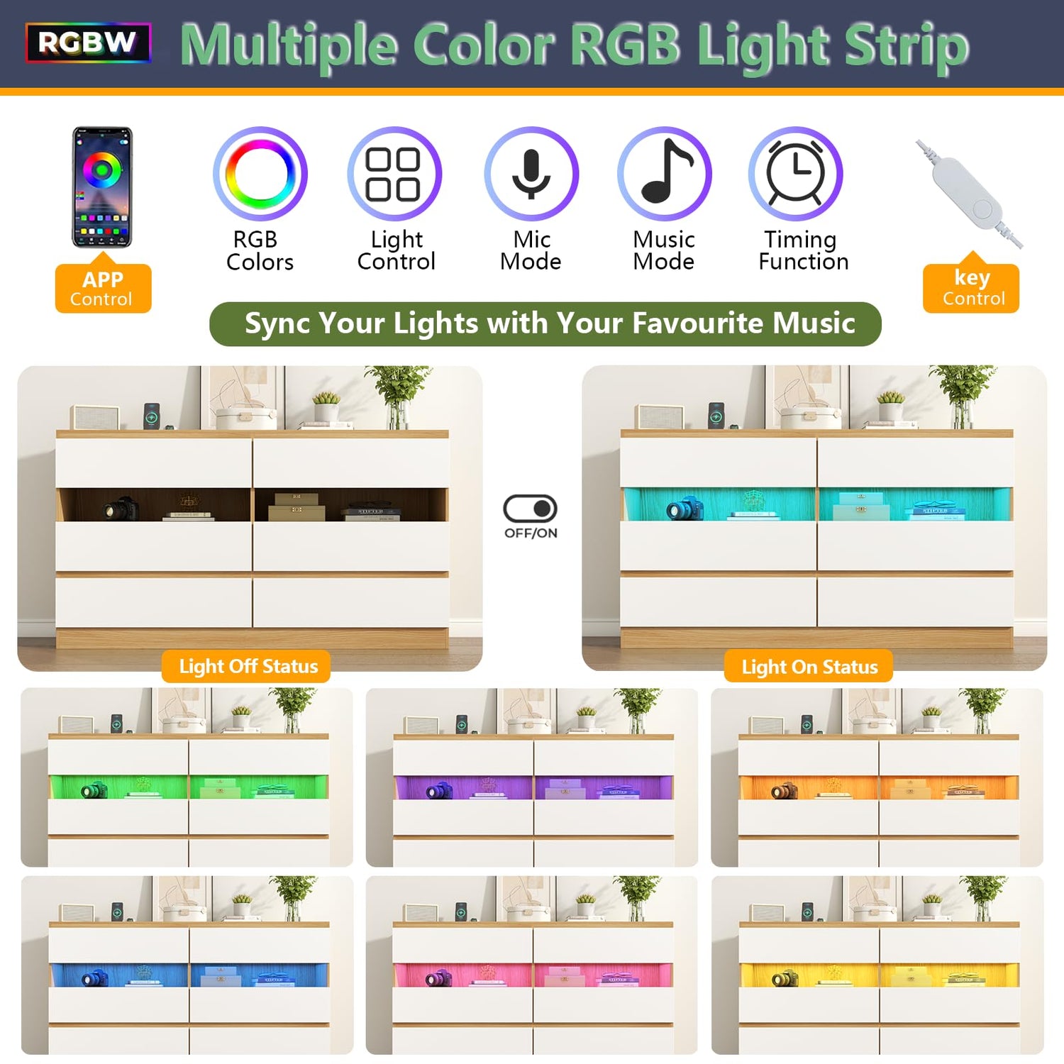 - 【6 Drawer Dresser with LED Lights】Elevate your space with this modern dresser featuring handle-less drawers and built-in RGB LED lighting. Its minimalist design blends seamlessly with any decor. You are free to set the color, brightness and mode to match the atmosphere you want.