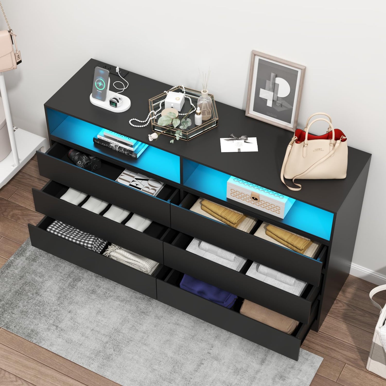 - Storage Dresser Chest with LED Light - This 6 Drawer Double Dresser comes with beautiful multi-color RGB led light. You can control the light strip through the included remote or APP to freely change in 16 million colors,adjust brightness, or customize modes (Flashing,Jump,Fade,etc) in different speeds.
