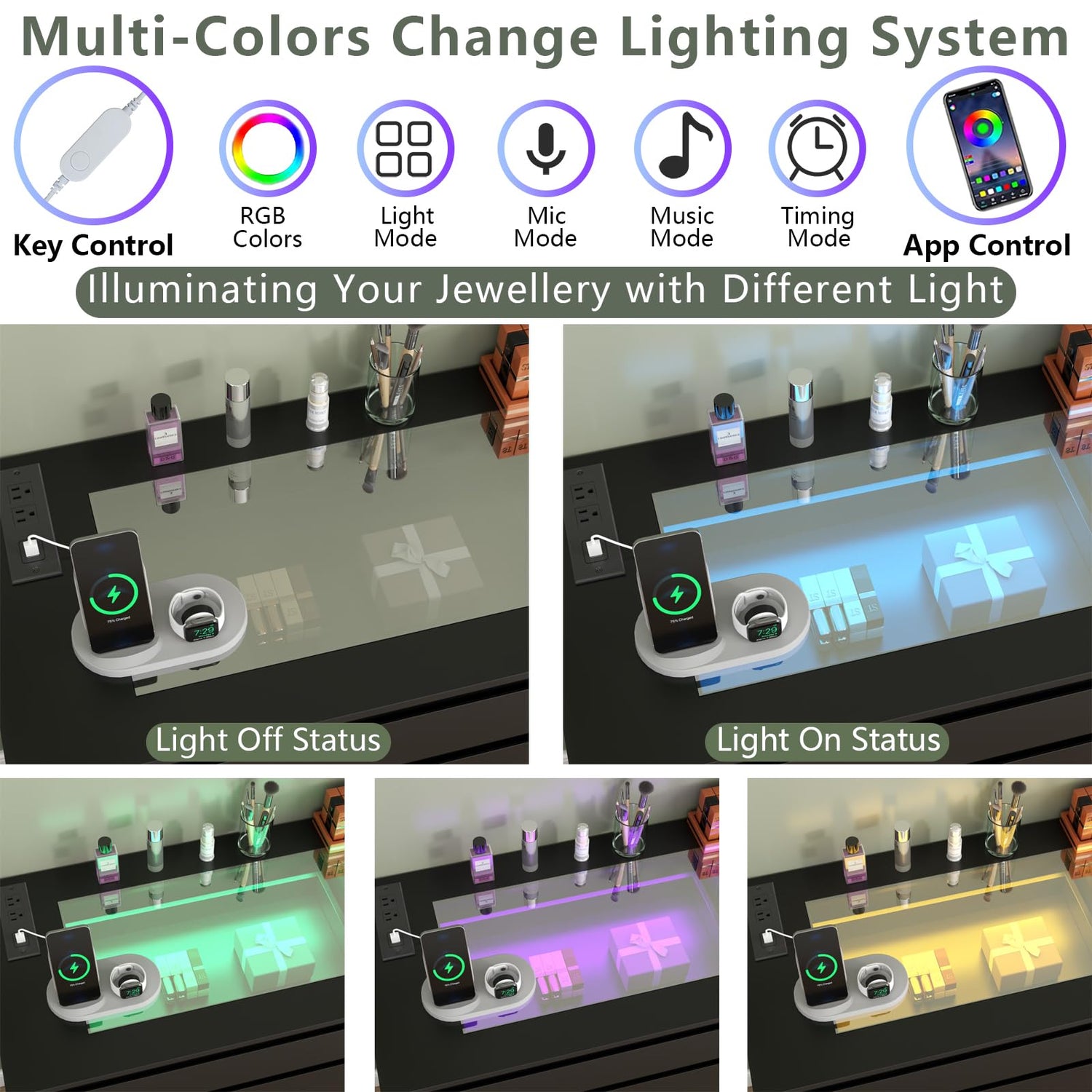 - [RGB Colorful Glass Top] The LED dressser features a semi-transparent glass top with built-in multicolor RGB light strips. The lighting effects can be freely adjusted via a remote control to create an ambient atmosphere. When illuminated, it infuses the space with vibrant and dreamy visual appeal while keeping items like cosmetics and jewelry clearly visible. This clever combination of style and practicality makes the dresser a standout addition to any bedroom or living area.
